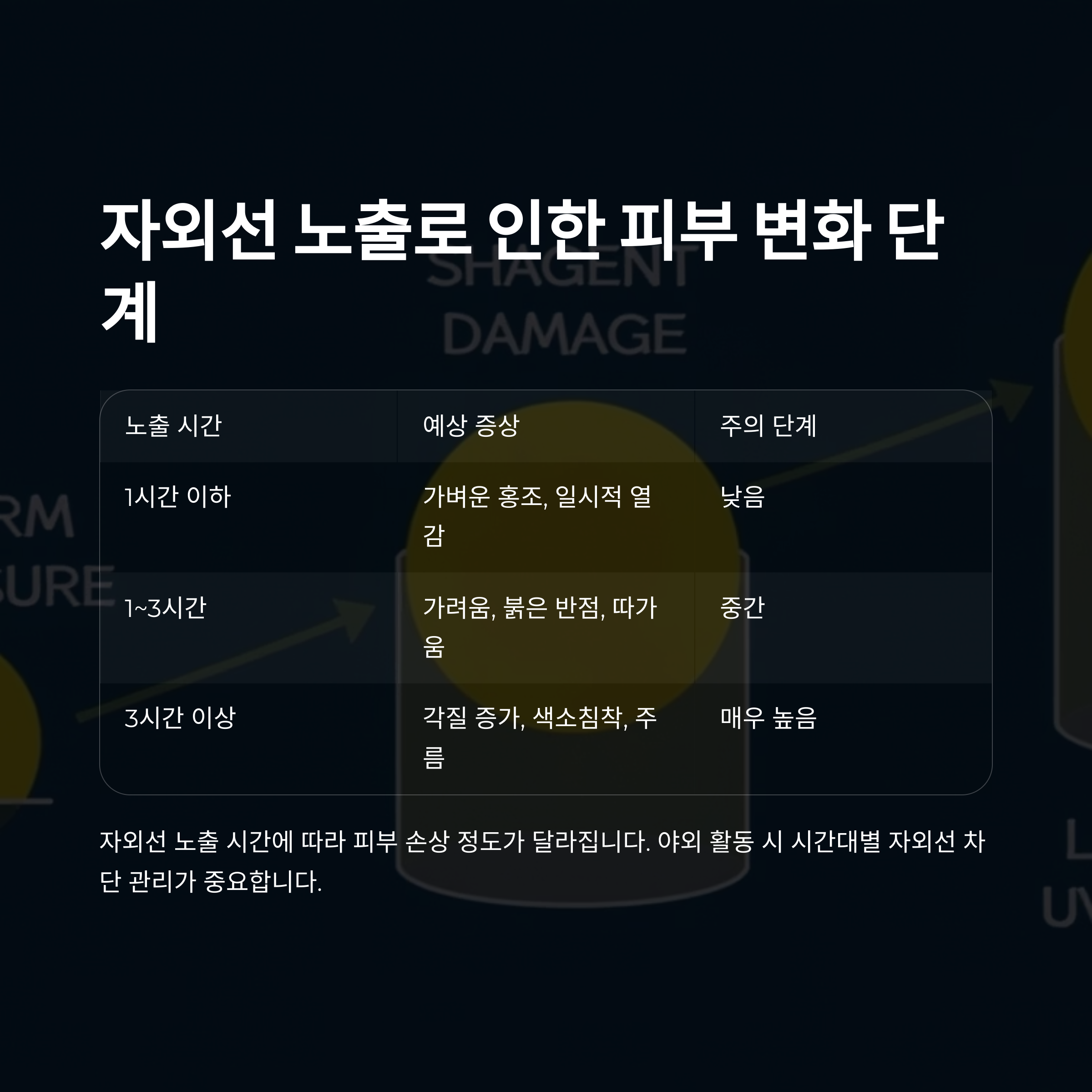 3시간 이상 | 각질 증가, 색소침착, 주름 | 매우 높음 |