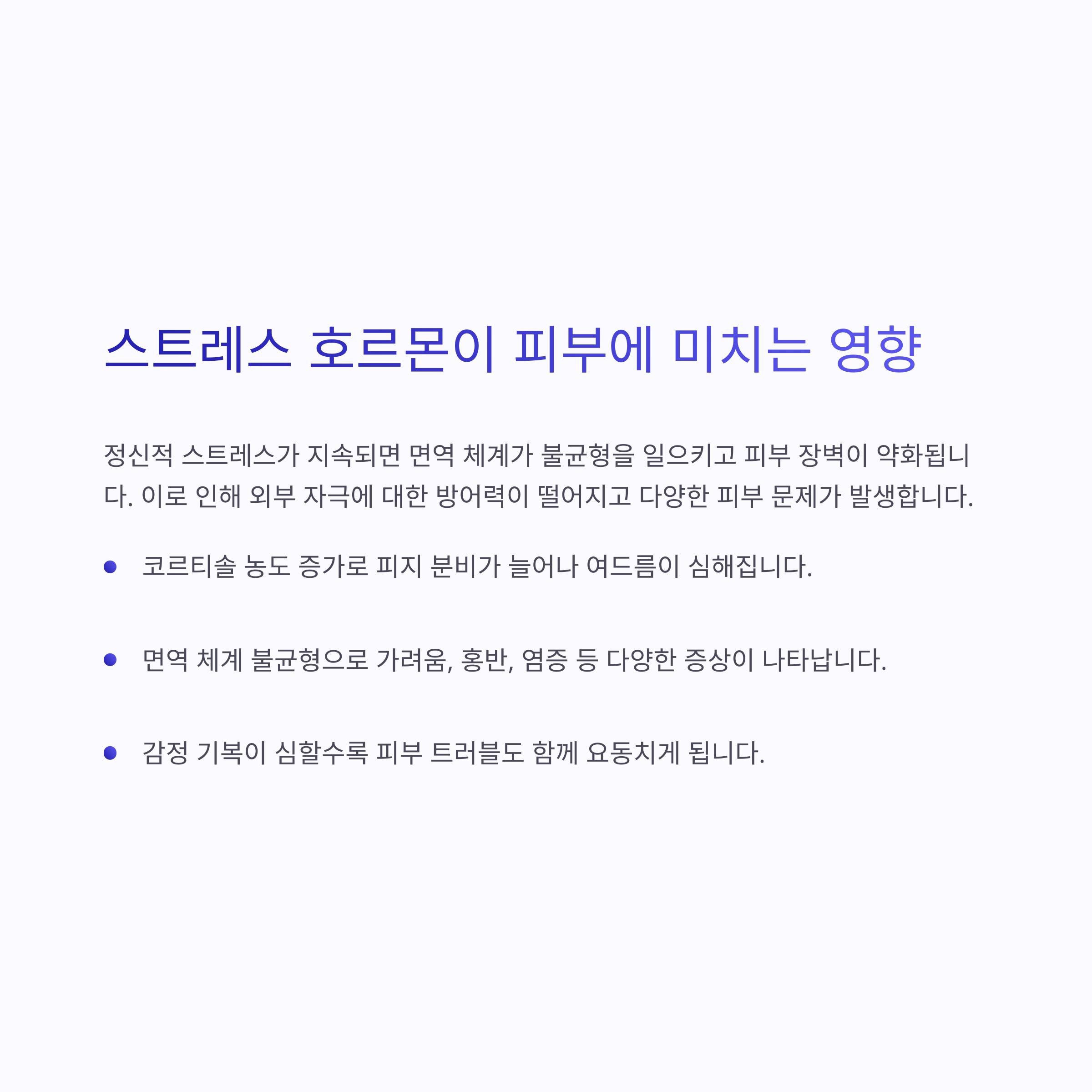 피부는 단순한 외피가 아니라 뇌와 밀접하게 연결된 신경기관으로 분류됩니다. 스트레스 상황에서는 자율신경계가 활성화되면서 코르티솔이라는 스트레스 호르몬이 증가하게 되며 이 호르몬은 염증반응을 자극해 피부 트러블을 유발합니다. 이러한 반응은 특히 아토피, 건선, 지루성피부염과 같은 만성 피부질환에서 더욱 뚜렷하게 나타나며 정신적 긴장이 높아질수록 증상이 악화되기 쉽습니다.