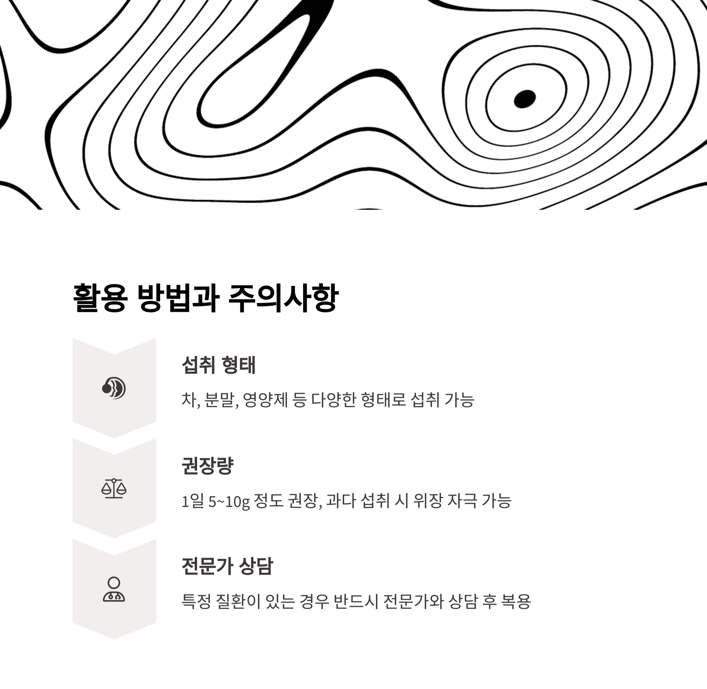 하지만 과다 섭취 시 위장 자극 가능성이 있으므로, 1일 5~10g 정도를 권장량으로 유지해야 합니다.