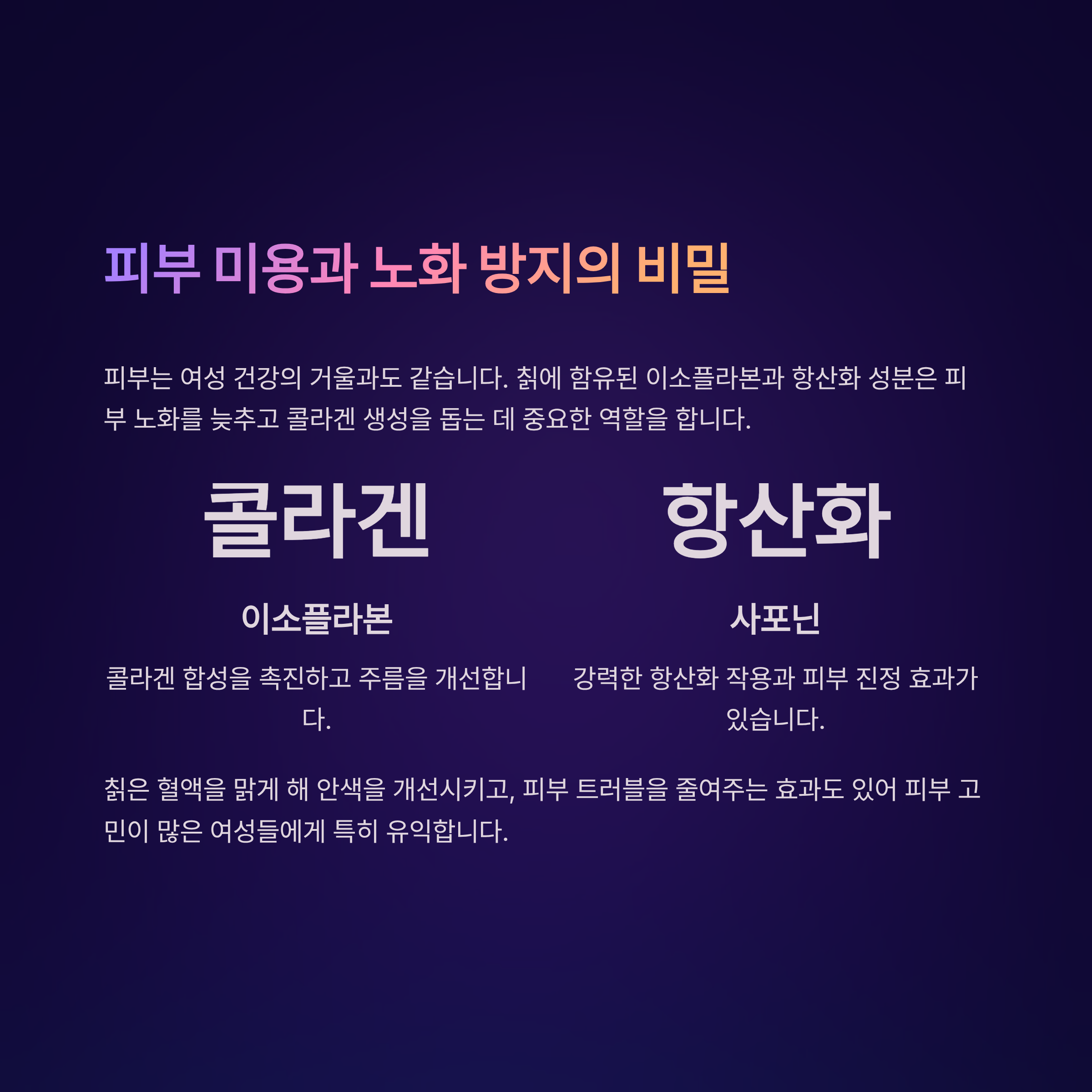 피부 노화를 늦추고 콜라겐 생성을 돕는 데 중요한 역할을 합니다.