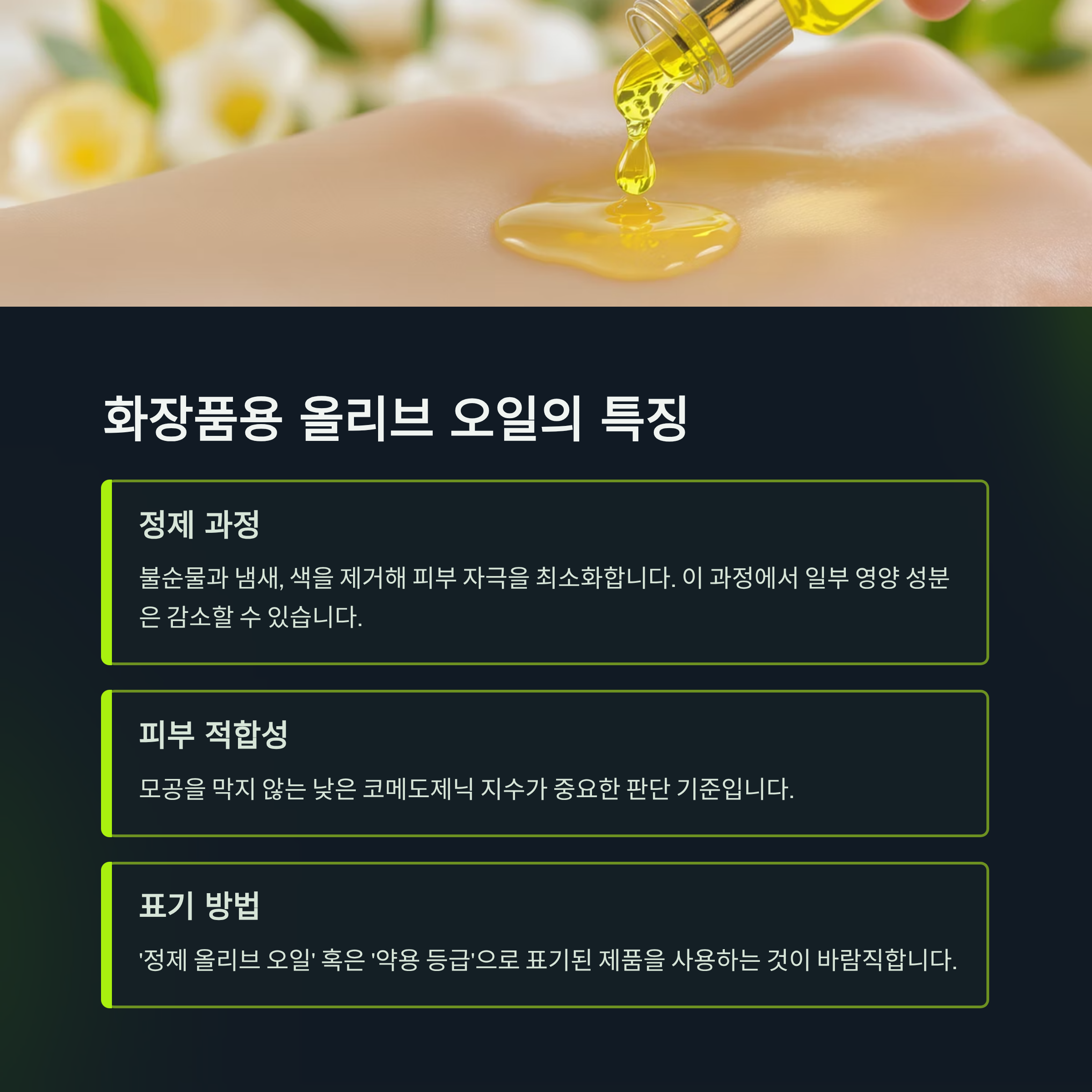 중요한 판단 기준입니다. 따라서 화장품용은 ‘정제 올리브 오일’ 혹은 ‘약용 등급’으로