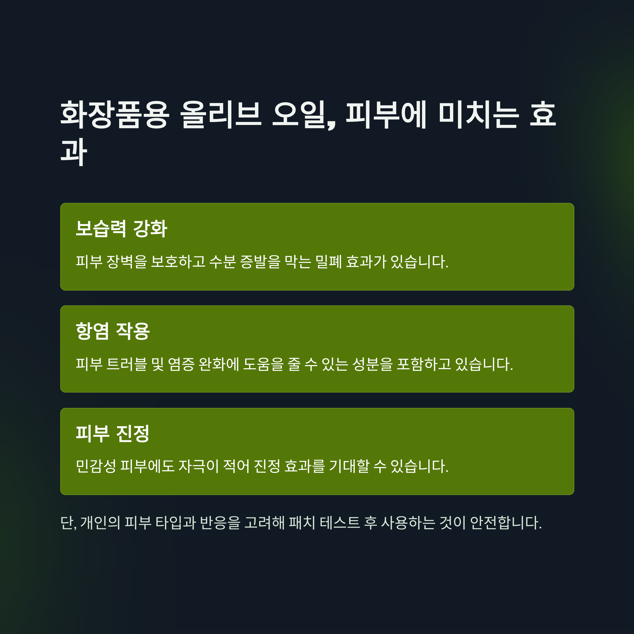 피부에 바르는 올리브 오일은 다음과 같은 효능을 기대할 수 있습니다.