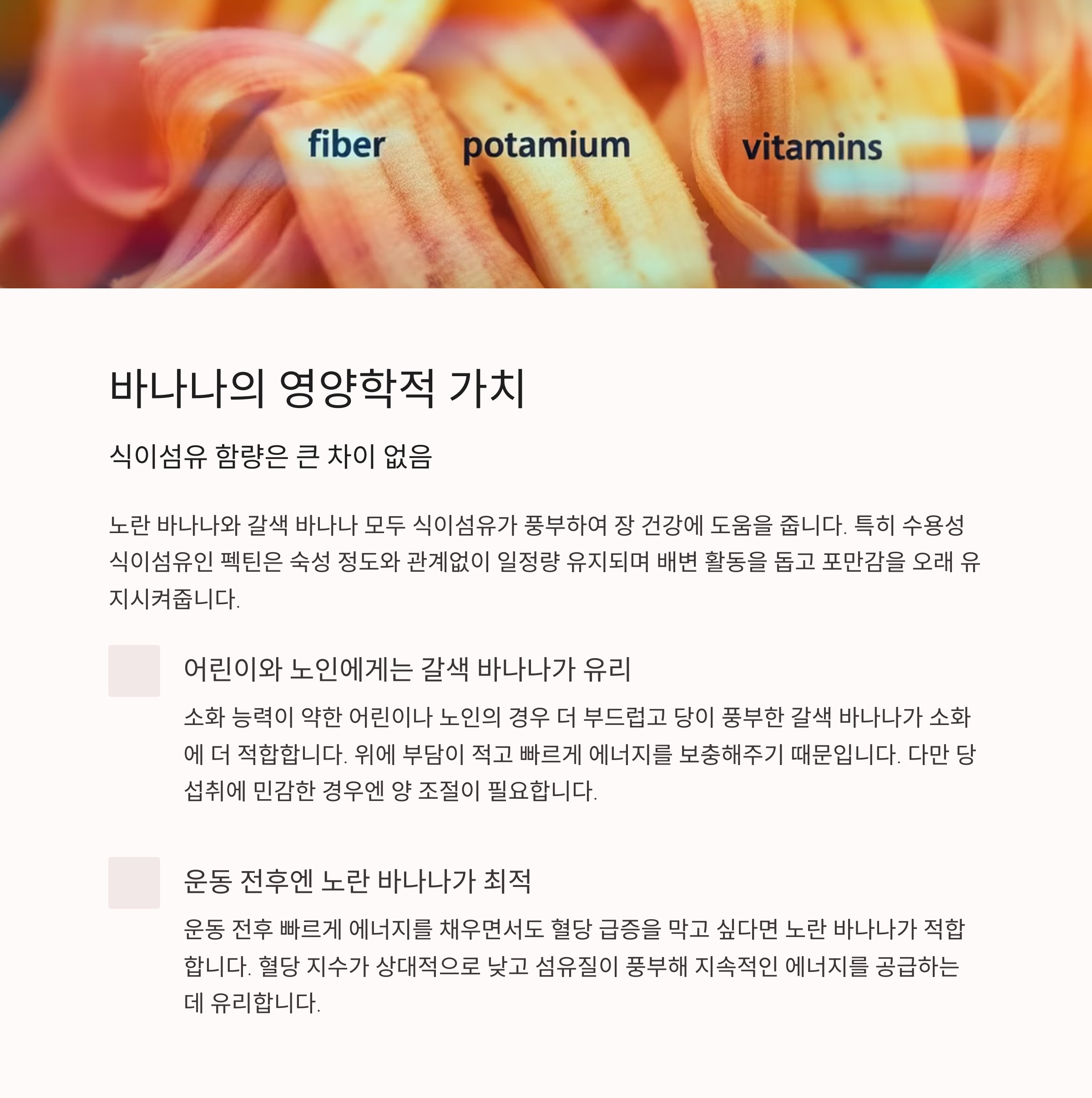 | 갈색 바나나 | 약 60~70 | 높음 | 매우 좋음 |