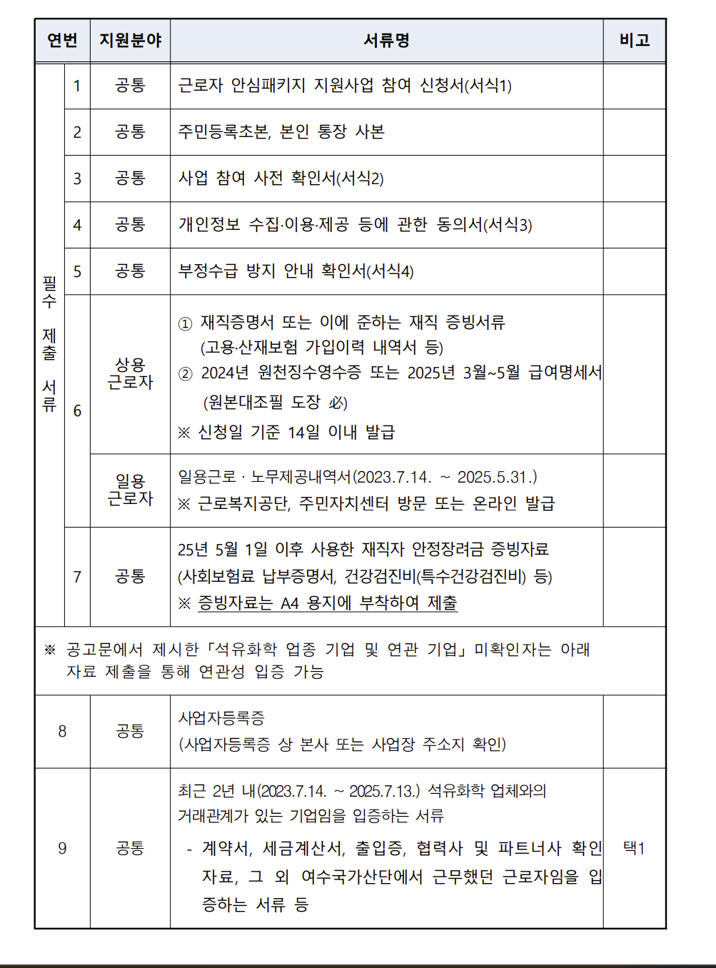 | 근로 또는 퇴직 증빙서류 | 재직증명서, 급여명세서, 퇴직증명서 등 |