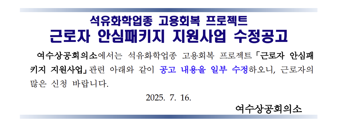 석유화학업종 고용회복 프로젝트 공식 안내자료 다운받기 : https://www.yeosu.go.kr/www/govt/news/notice?idx=562463&mode=view