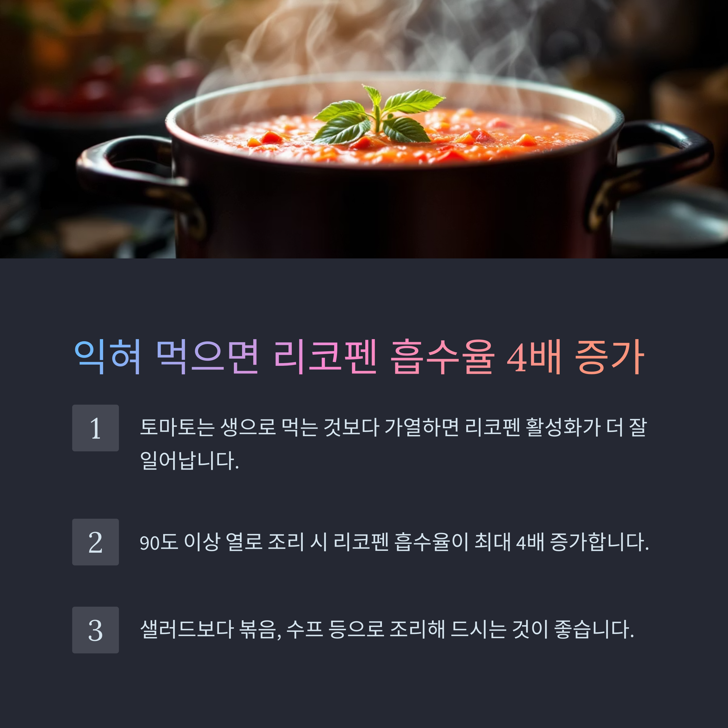 특히 90도 이상의 열로 조리할 경우 리코펜 흡수율은 최대 4배까지 증가하며