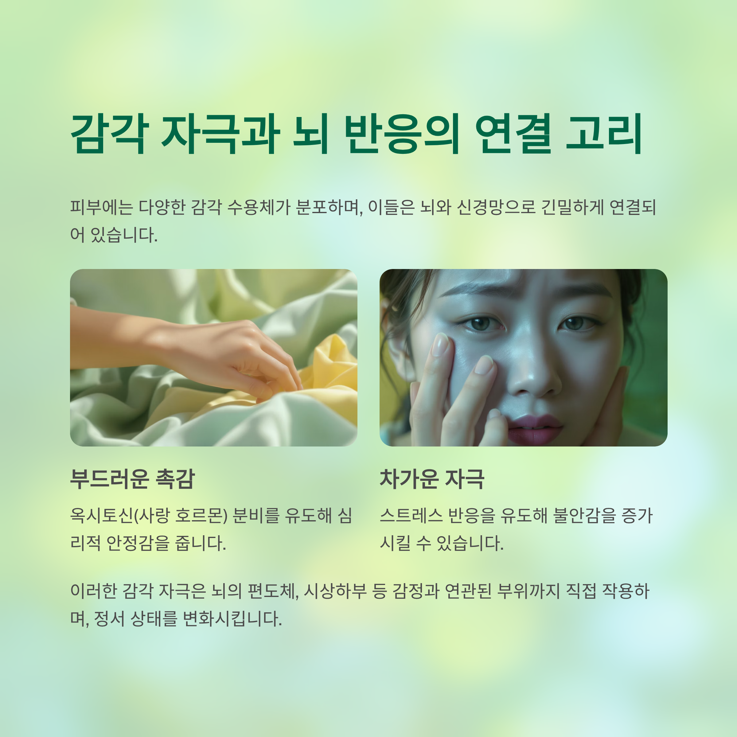 피부에는 다양한 감각 수용체가 분포되어 있으며, 이들은 뇌와 신경망으로 긴밀하게 연결되어 있습니다. 예를 들어 부드러운 촉감은 옥시토신의 분비를 유도해 심리적 안정감을 주고, 차가운 자극이나 통증은 스트레스 반응을 유도해 불안감을 증가시킬 수 있습니다. 이런 점에서 피부는 감정과 심리 상태에 영향을 미치는 주요 통로로 작용합니다.