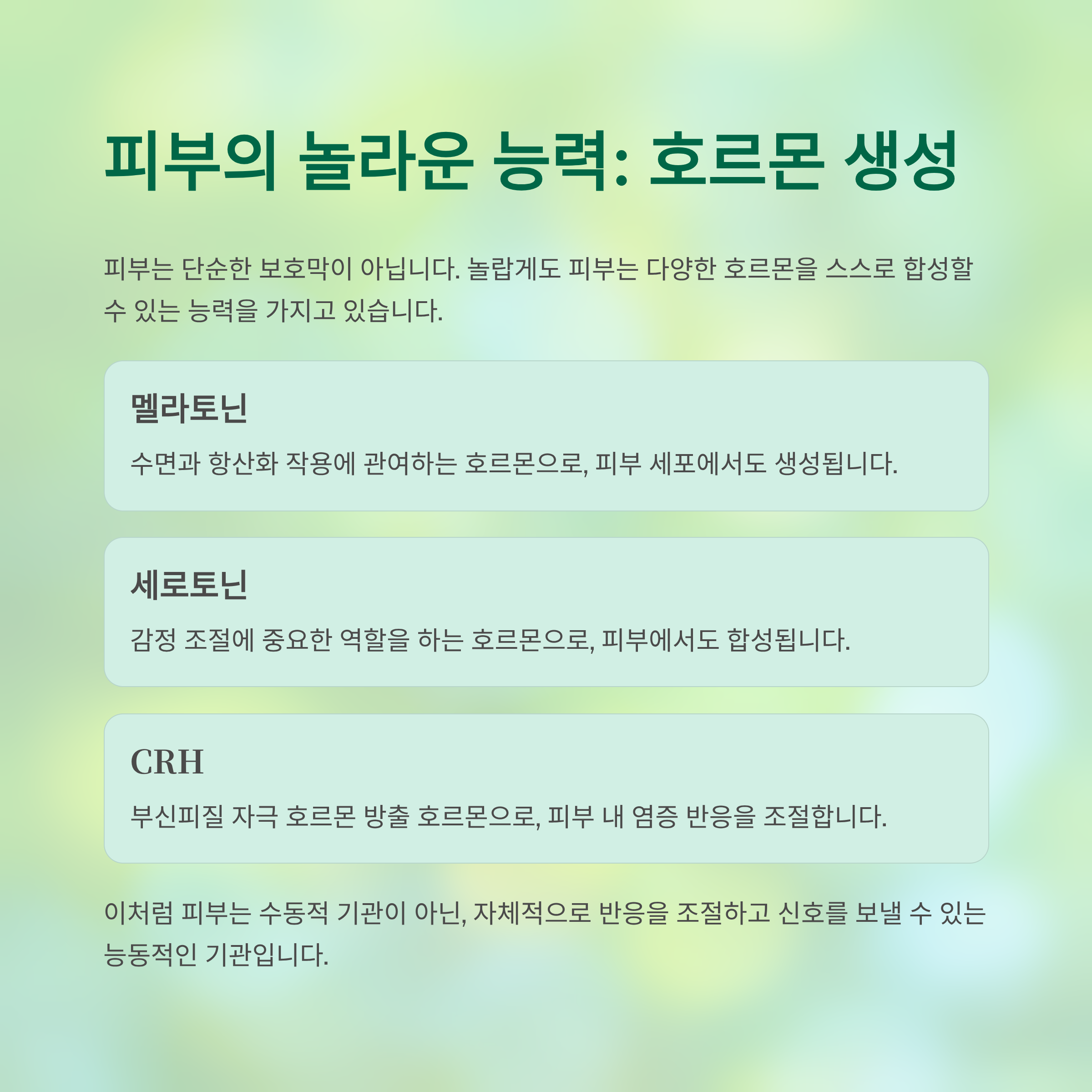 놀랍게도 피부는 다양한 호르몬을 스스로 합성할 수 있습니다. 대표적으로 멜라토닌, 세로토닌, CRH 등이 피부세포에서 생성될 수 있습니다. 이러한 호르몬은 피부 내 염증 반응을 조절하거나, 피부 장벽 회복에 직접적인 영향을 주는 것으로 나타났습니다. 즉, 피부는 능동적인 기관이라는 관점이 가능해집니다.