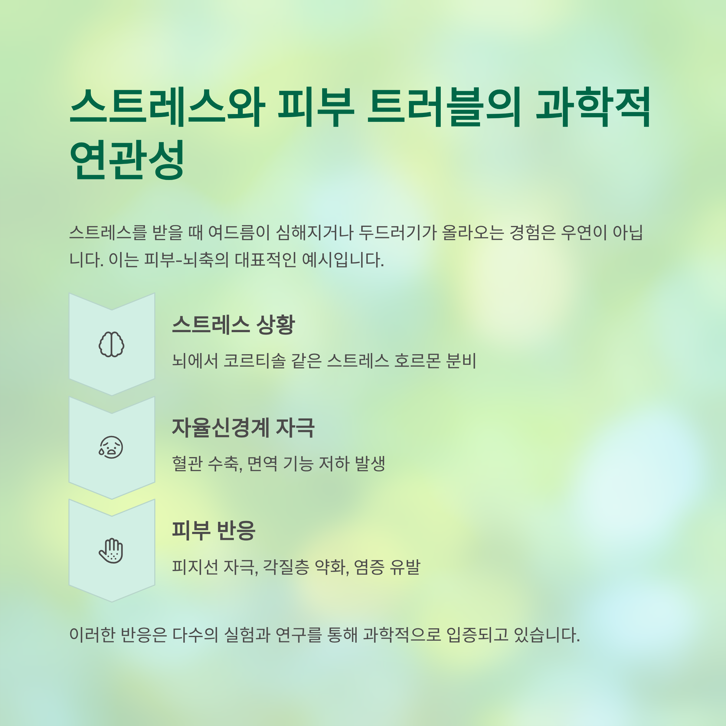 스트레스를 받을 때 여드름이 심해지거나 두드러기가 올라오는 경험, 많은 분들이 해보셨을 겁니다. 이는 우연이 아니라, 피부-뇌축의 대표적인 예시 중 하나입니다. 스트레스 상황에서는 뇌에서 코르티솔 같은 스트레스 호르몬이 분비되며, 이는 피부의 피지선 자극, 각질층 약화, 염증 유발 등을 일으킬 수 있습니다. 이러한 반응은 다수의 실험과 연구를 통해 입증되고 있습니다.