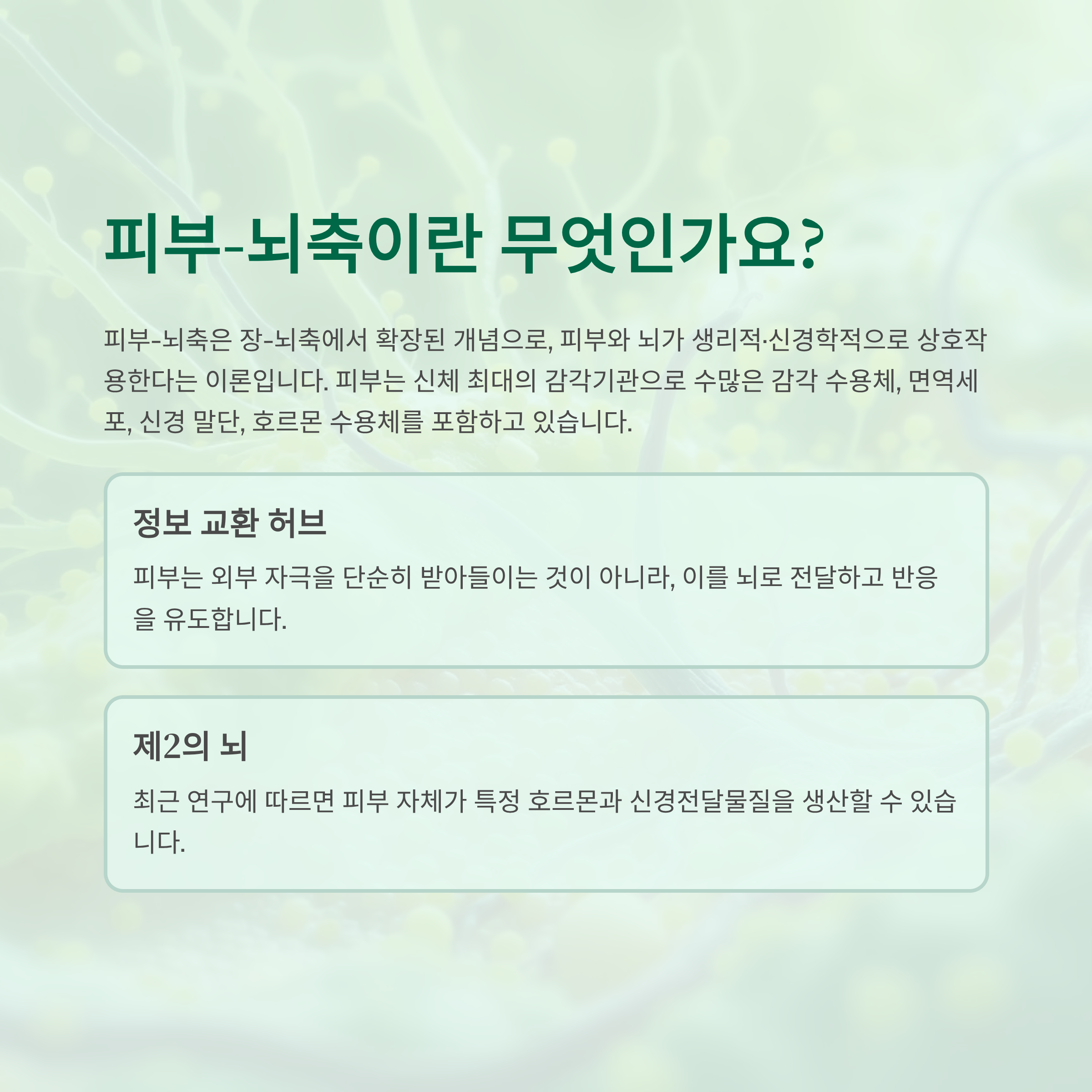 피부-뇌축(Skin-Brain Axis)은 장-뇌축(Gut-Brain Axis)에서 출발한 확장 개념으로, 피부와 뇌가 생리적·신경학적으로 상호작용할 수 있다는 가설입니다. 피부는 신체 최대의 감각기관으로 수많은 감각 수용체와 면역세포, 신경 말단, 호르몬 수용체를 포함하고 있습니다. 심지어 최근에는 피부 자체가 특정 호르몬과 신경전달물질을 생산한다는 연구 결과도 나오면서, 피부가 ‘제2의 뇌’라는 별명을 얻게 되었습니다.