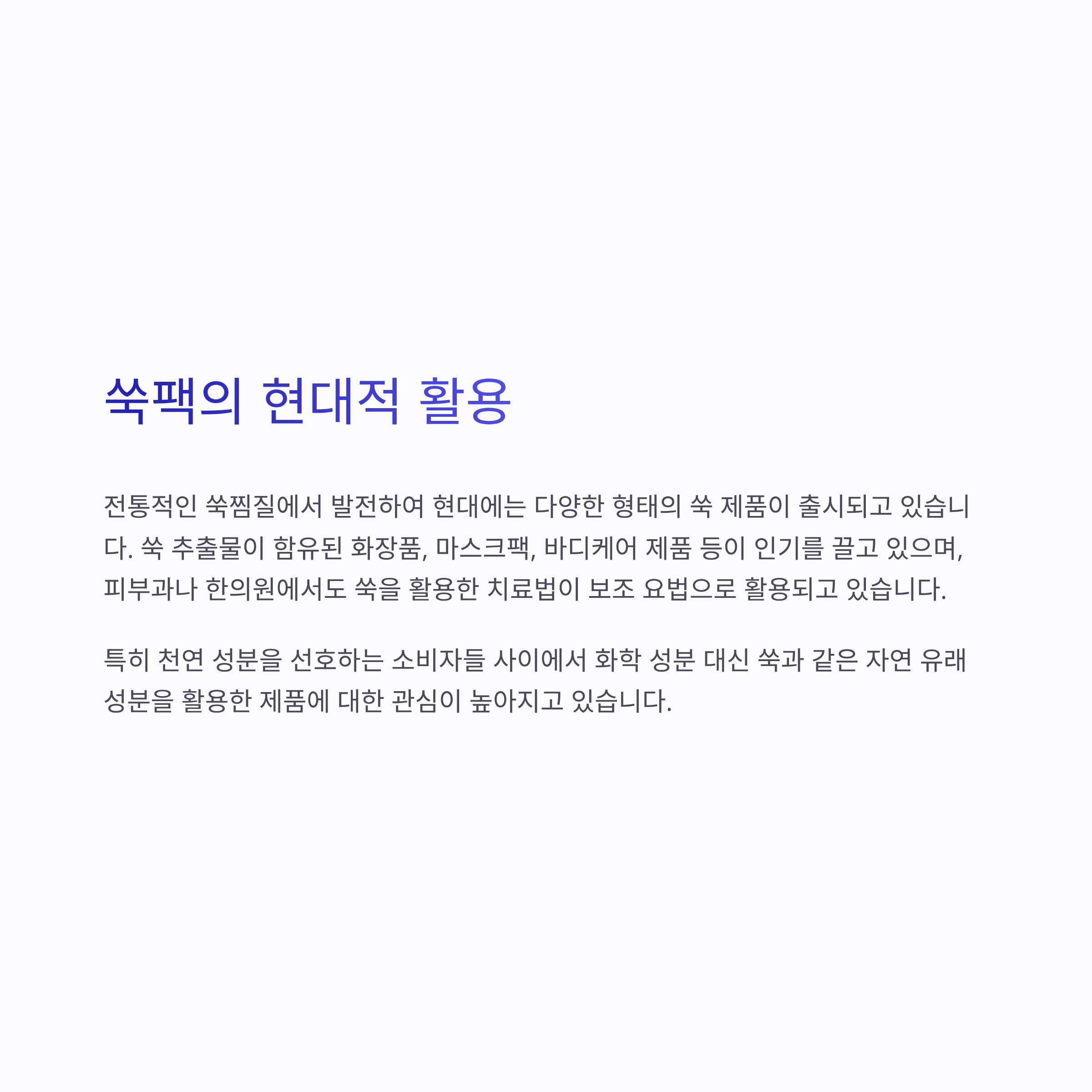 전통적으로 내려온 요법이라는 점에서 의사들은 쑥팩을 ‘민간요법’으로 분류하곤 하지만, 쑥에 포함된 성분이 과학적으로 입증된 효능을 보이는 부분도 분명 존재합니다. 최근에는 대체의학 영역이나 피부과에서 쑥 유래 성분을 활용한 제품들이 하나둘씩 등장하면서 전문 영역에서도 관심을 갖고 있는 추세입니다. 즉, 아직은 명확한 의료적 효능이라고 단정할 순 없지만 부작용이 크지 않다는 점에서 보조 요법으로 활용할 수 있는 가능성 있는 자연치유법이라 할 수 있습니다.