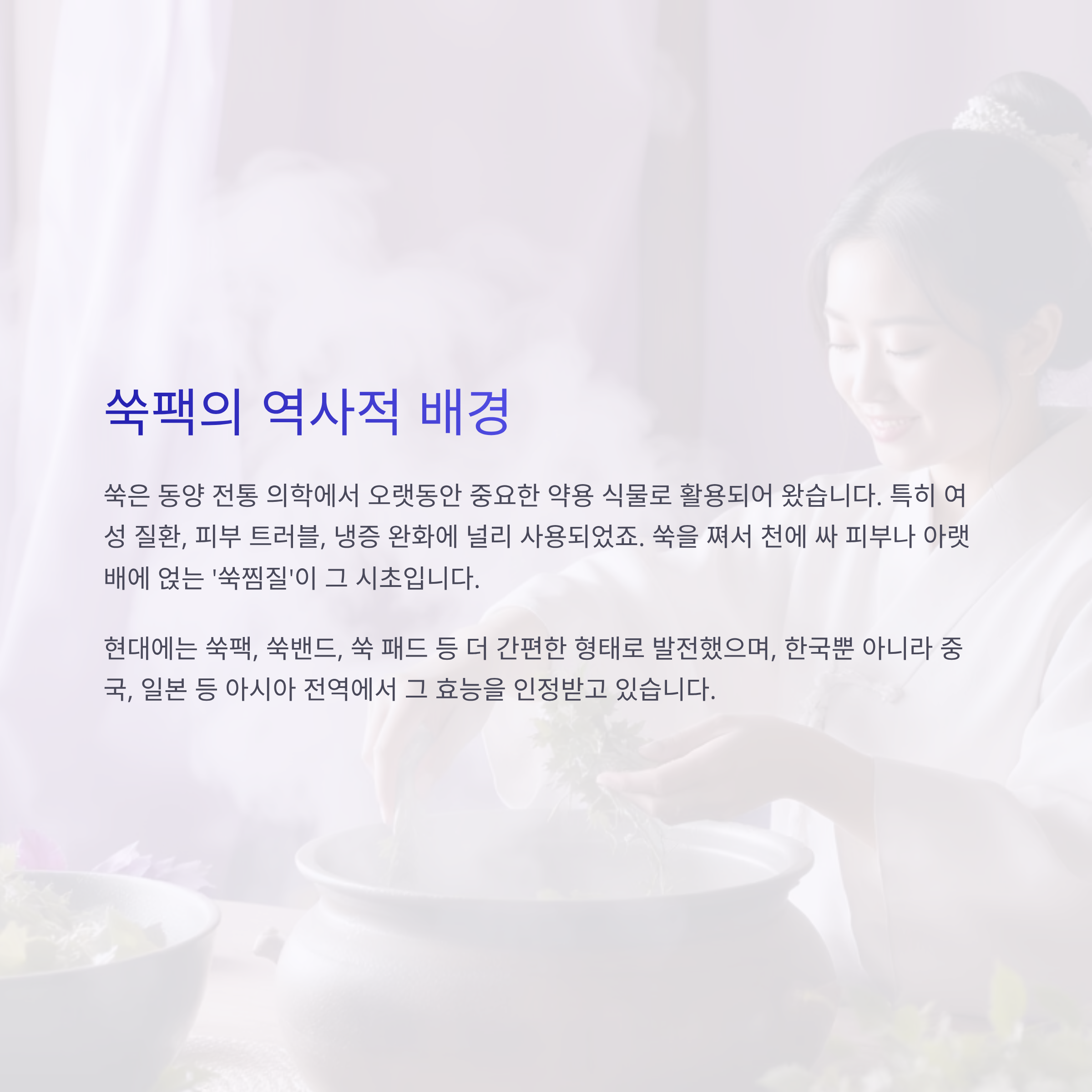 쑥은 동양의 전통 의학에서 대표적인 약용 식물로 꼽히며, 특히 여성 질환이나 피부 트러블, 냉증 완화에 오랜 기간 활용되어 왔습니다. 쑥을 쪄서 천에 싸 피부나 아랫배에 얹는 ‘쑥찜질’이 그 시초이며, 현대에는 이를 간편화한 형태로 쑥팩이나 쑥밴드, 쑥 패드 등이 등장했습니다. 우리나라뿐 아니라 중국, 일본 등에서도 유사한 방법으로 활용되어 온 만큼 전통적으로 그 효능이 꽤 널리 인정받아 왔다고 할 수 있습니다.