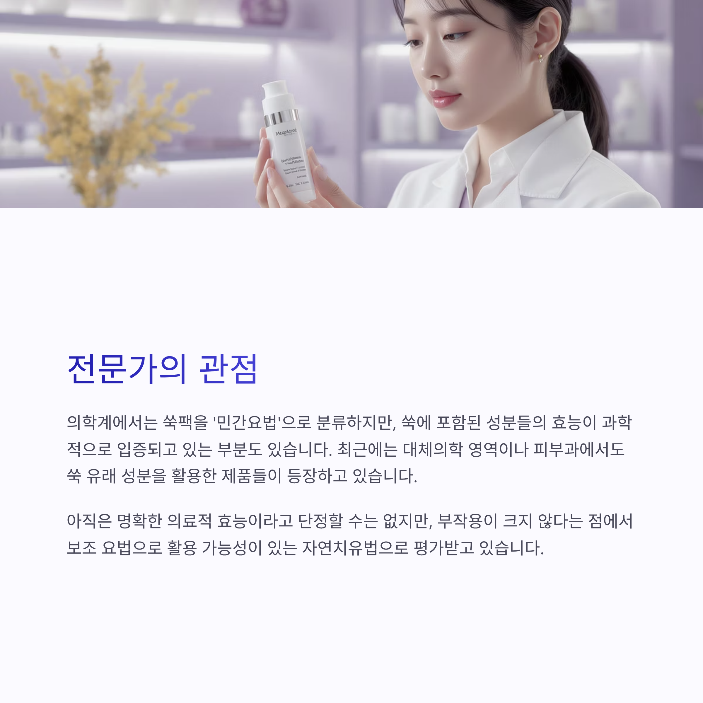 전통적으로 내려온 요법이라는 점에서 의사들은 쑥팩을 ‘민간요법’으로 분류하곤 하지만, 쑥에 포함된 성분이 과학적으로 입증된 효능을 보이는 부분도 분명 존재합니다. 최근에는 대체의학 영역이나 피부과에서 쑥 유래 성분을 활용한 제품들이 하나둘씩 등장하면서 전문 영역에서도 관심을 갖고 있는 추세입니다. 즉, 아직은 명확한 의료적 효능이라고 단정할 순 없지만 부작용이 크지 않다는 점에서 보조 요법으로 활용할 수 있는 가능성 있는 자연치유법이라 할 수 있습니다.