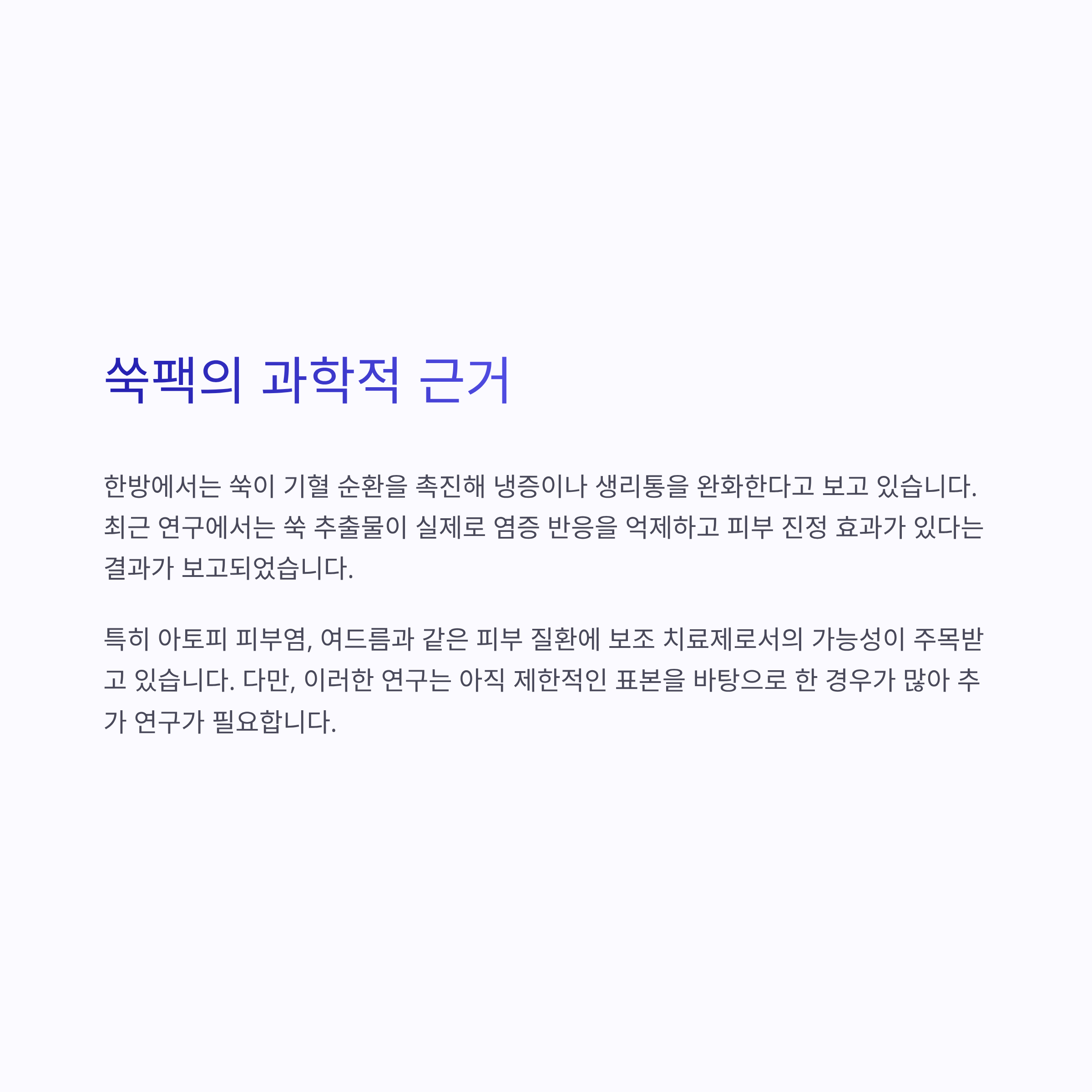 한방에서는 쑥이 기혈 순환을 도와 냉증이나 생리통을 완화한다고 보고 있으며 일부 연구에서는 쑥 추출물이 염증 반응을 억제하고 피부 진정 효과가 있다는 결과도 보고된 바 있습니다. 특히 아토피 피부염, 여드름과 같은 피부 질환에 보조 치료제로 적용 가능성이 제기되고 있습니다. 다만, 이러한 연구는 제한적인 표본을 바탕으로 한 경우가 많기 때문에 전문의와의 상담 없이 무분별하게 활용하는 것은 주의가 필요합니다.