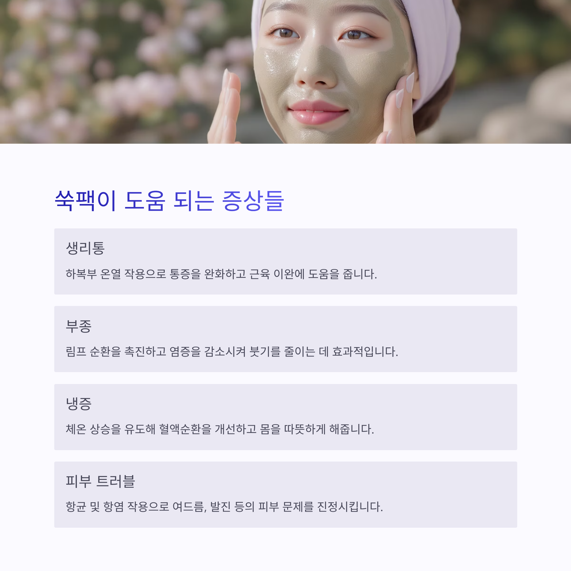쑥팩은 다음과 같은 증상에 보완 요법으로 활용되곤 합니다. 피부에만 좋은 것이 아니라 몸 전체에도 긍정적인 영향을 줄 수 있다고 알려져 있습니다.