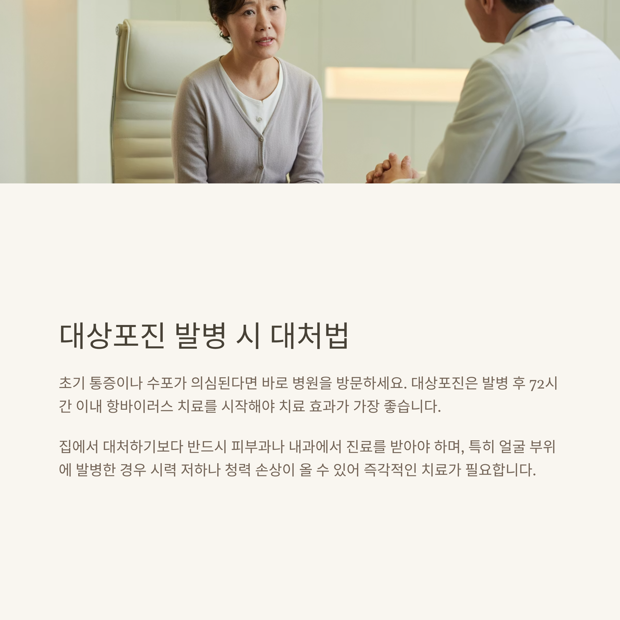 초기 통증이나 수포가 의심된다면 바로 병원을 방문하세요.