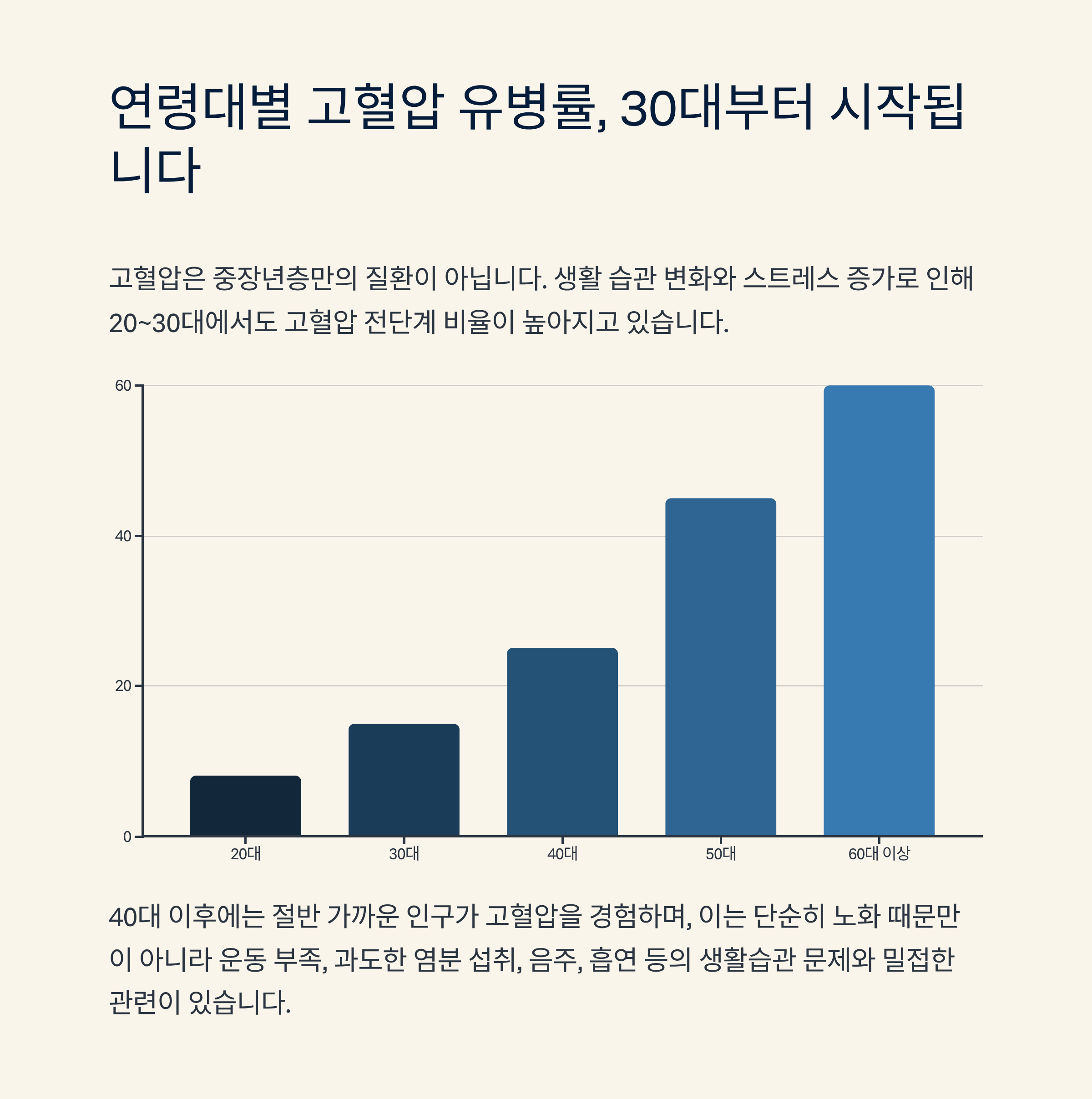 고혈압은 중장년층만의 질환이 아닙니다. 생활 습관 변화와 스트레스 증가로 인해 20~30대에서도 고혈압 전단계 비율이 높아지고 있습니다.