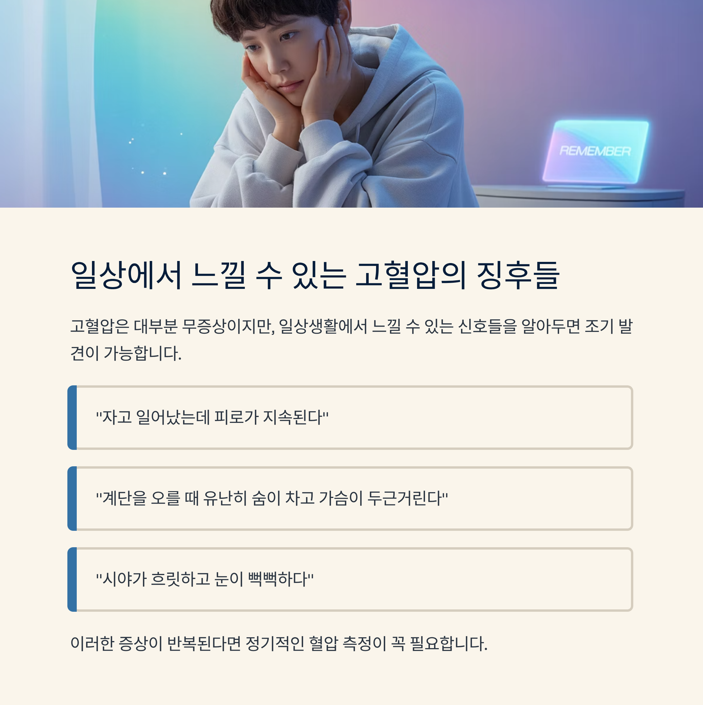 고혈압은 대부분 무증상이지만, 일상생활에서 느낄 수 있는 신호들을 알아두면 조기 발견이 가능합니다. "자고 일어났는데 피로가 지속된다", "계단을 오를 때 유난히 숨이 차고 가슴이 두근거린다", "시야가 흐릿하고 눈이 뻑뻑하다" 등은 고혈압의 잠재적 신호일 수 있습니다. 이러한 증상이 반복된다면 정기적인 혈압 측정이 꼭 필요합니다.