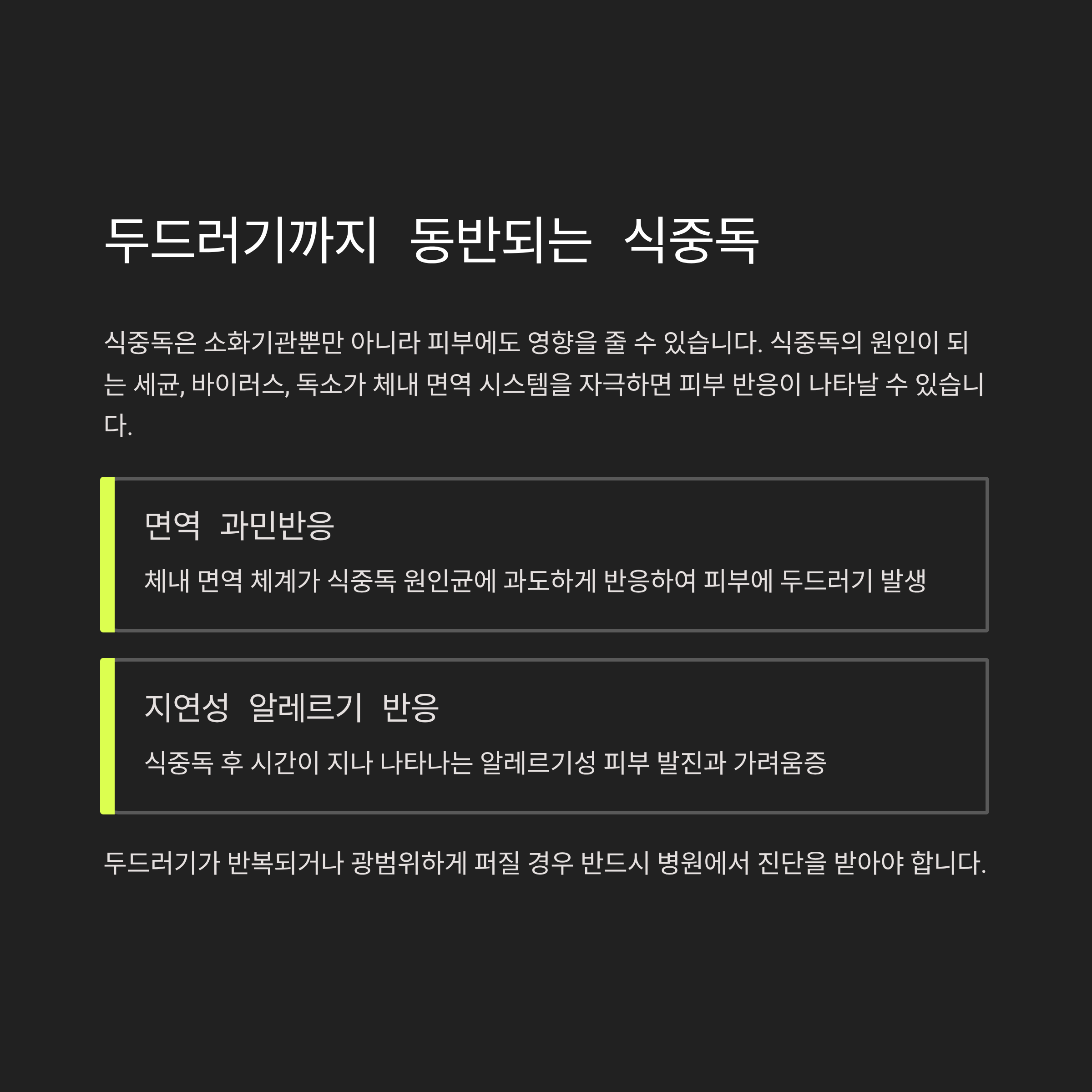 이때 가장 흔히 나타나는 증상이 바로 두드러기입니다. 식중독을 겪은 후 몸에 붉은 발진이나 가려움이 동반된다면, 이는 "면역 과민반응" 또는 "지연성 알레르기 반응"일 가능성이 있습니다.
