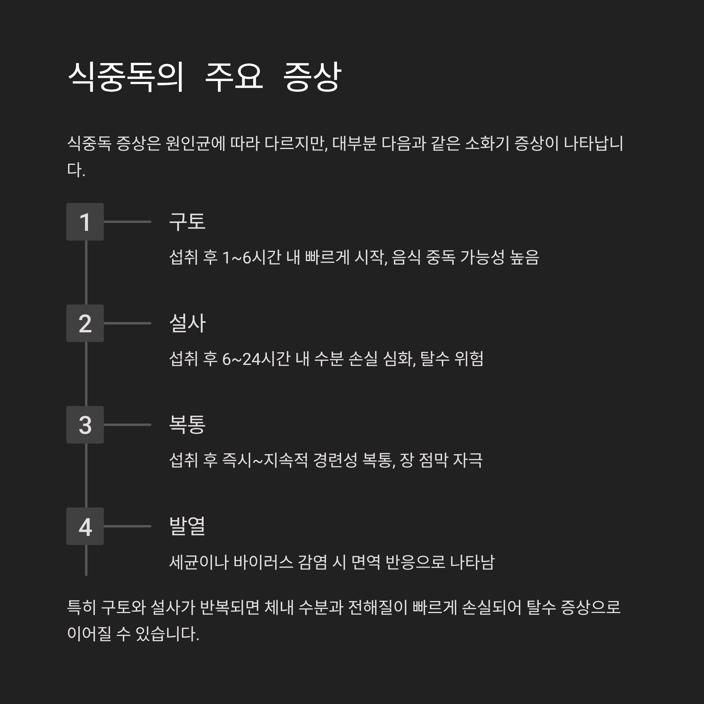 설사 | 섭취 후 6~24시간 내 | 수분 손실 심화, 탈수 위험 |
