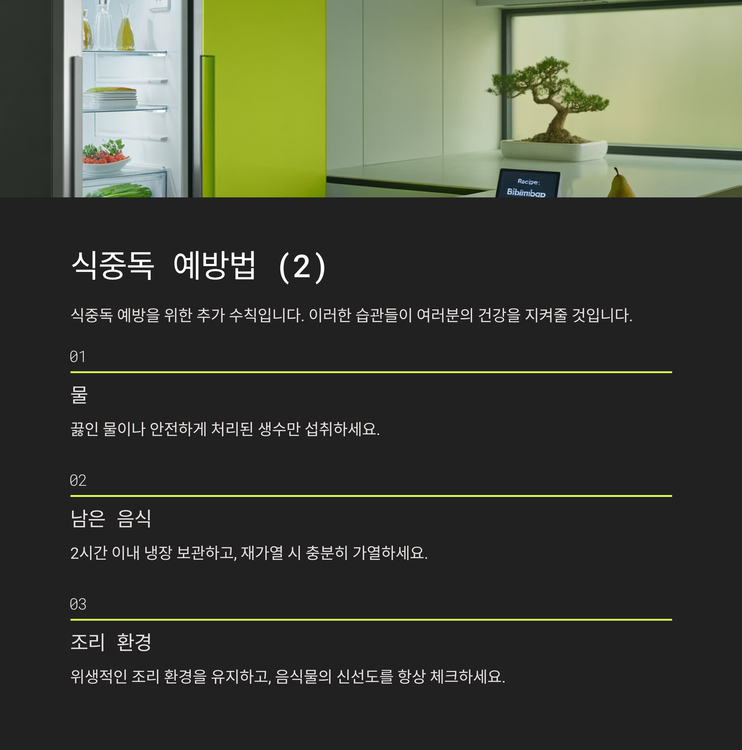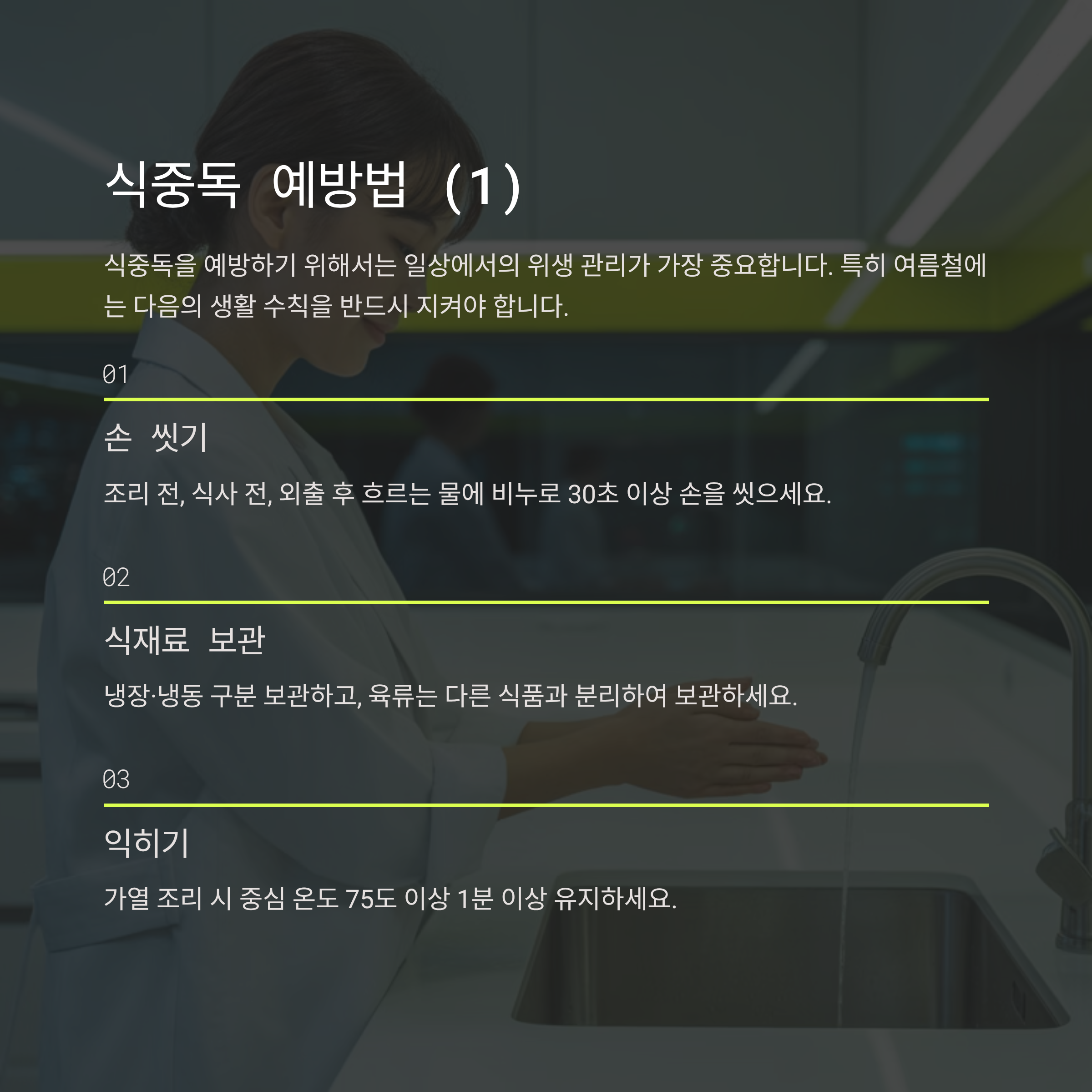 - 손 씻기: 조리 전, 식사 전, 외출 후 흐르는 물에 비누로 30초 이상