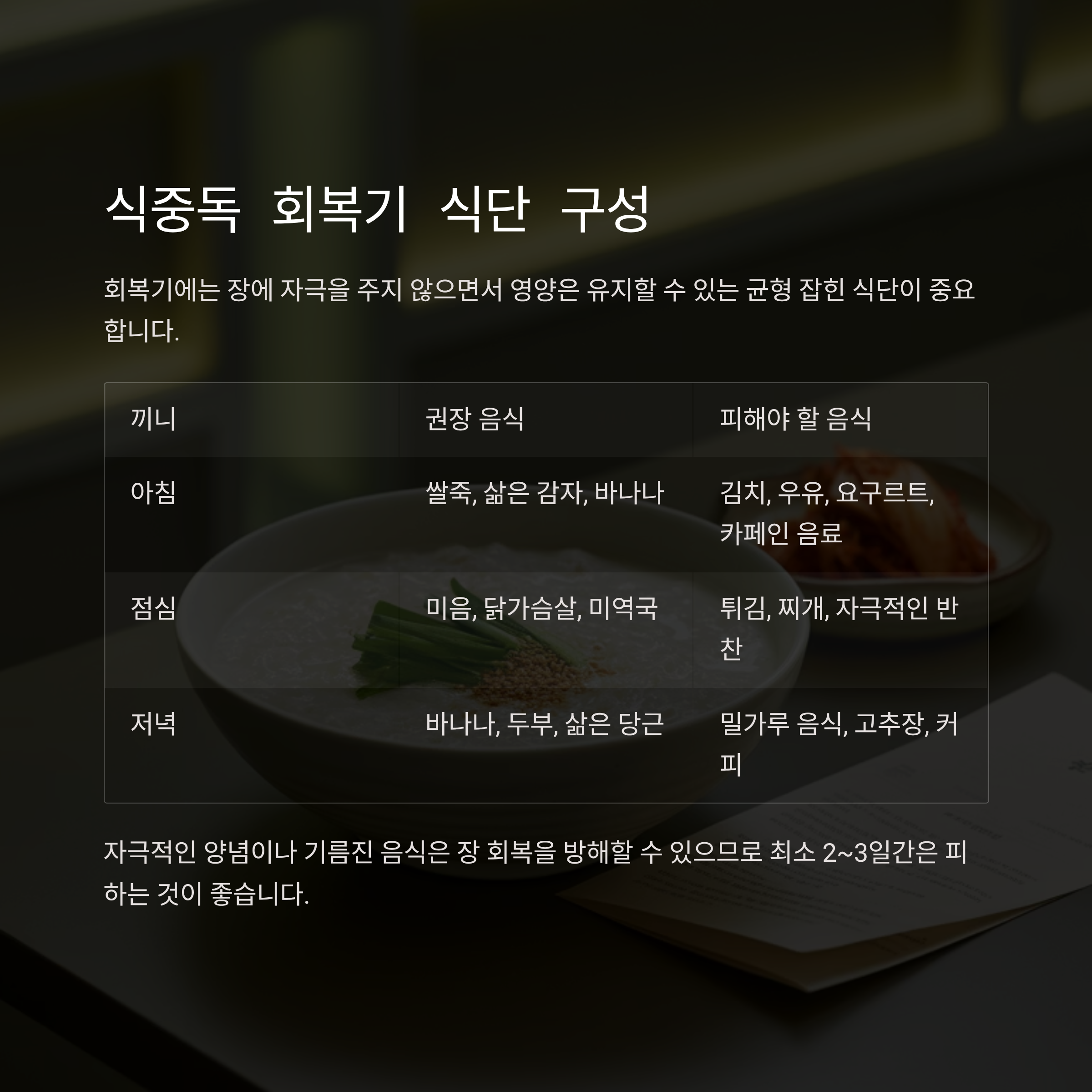 자극적인 양념이나 기름진 음식은 장 회복을 방해할 수 있으므로 최소 2~3일간은 피하는 것이 좋습니다.