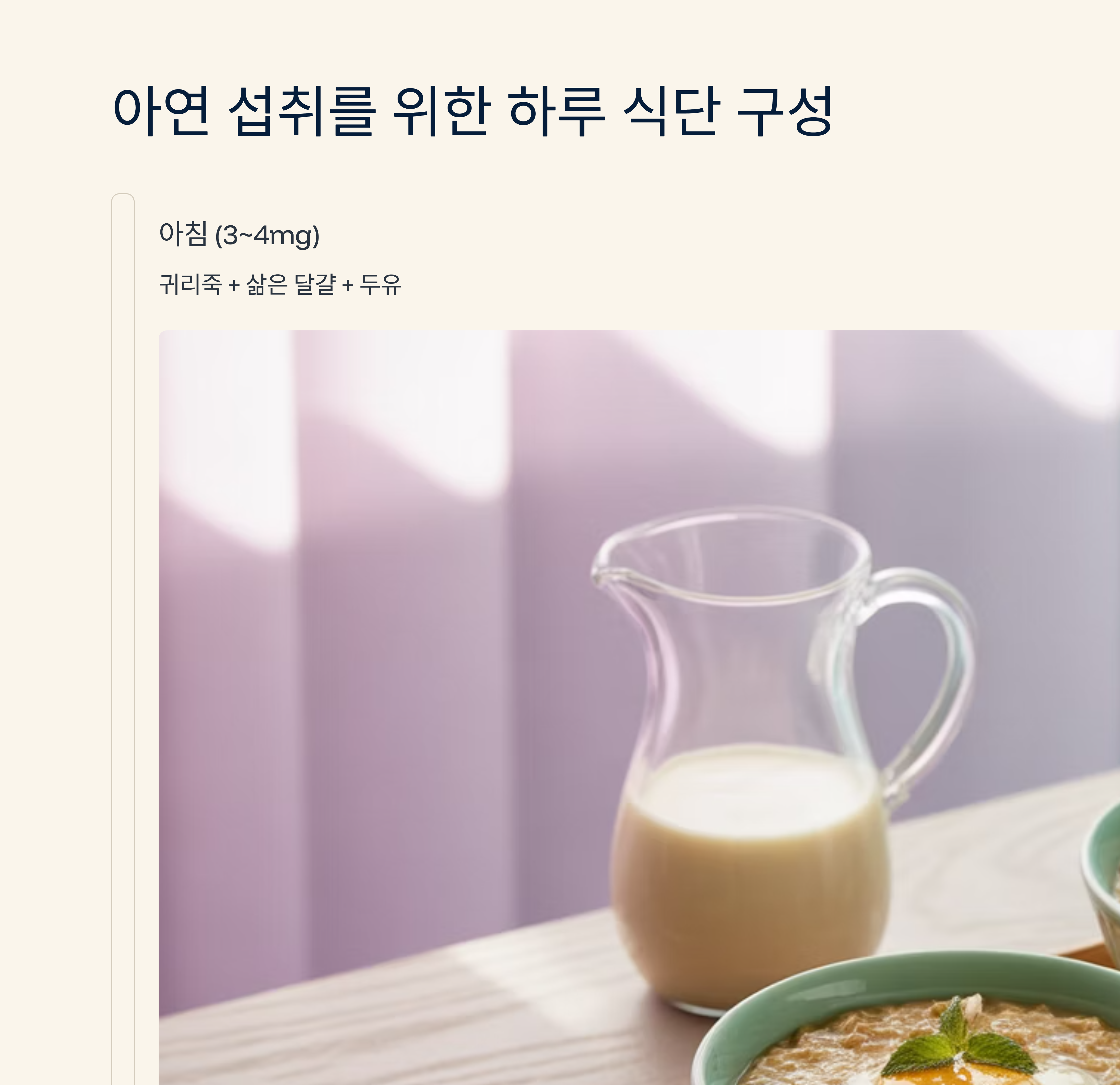 아침: 귀리죽 + 삶은 달걀 + 두유 | 3~4mg |