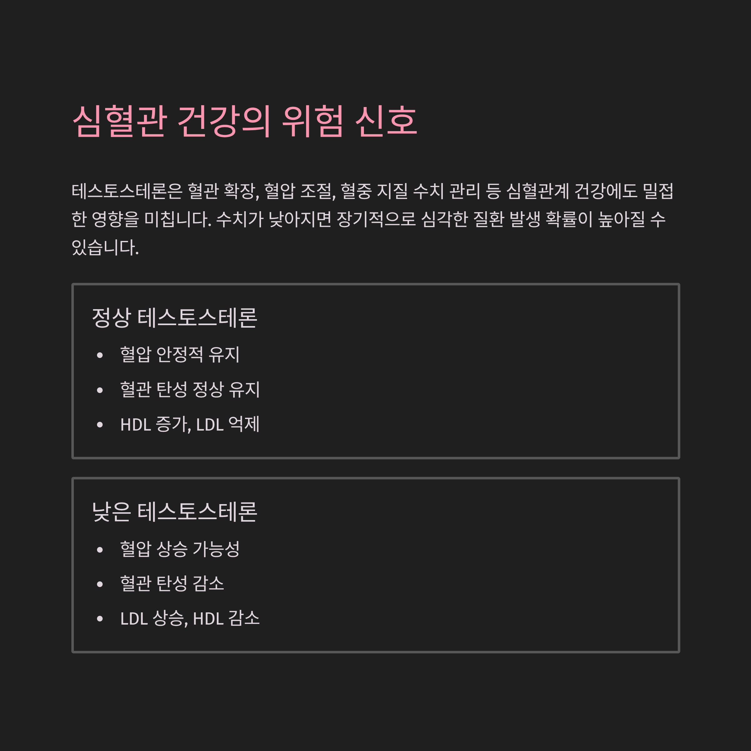 테스토스테론 검사는 단순히 성 기능과 관련된 검사가 아닙니다. 이 호르몬 수치는 신체 전반의 건강 상태를 반영하는 중요한 지표가 될 수 있습니다. 많은 분들이 테스토스테론 수치가 낮으면 단순히 성욕 저하나 피로만 생각하기 쉽지만, 실제로는 근육량 감소, 수면장애, 감정 기복, 심혈관 질환까지 영향을 줄 수 있어 조기 진단이 매우 중요합니다. 본 글에서는 테스토스테론 검사를 통해 어떤 건강 신호를 발견할 수 있는지, 그리고 수치가 낮아졌을 때 나타날 수 있는 위험 요소들을 중심으로 자세히 설명드리겠습니다. 중년 남성뿐만 아니라 여성에게도 관련이 있는 만큼 누구나 참고해볼 수 있는 건강 정보입니다.