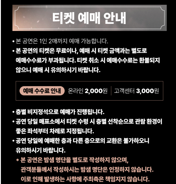 비용 : 전석 무료, 예매 수수료 별도발생(온라인 2000원, 고객센터 3000원)