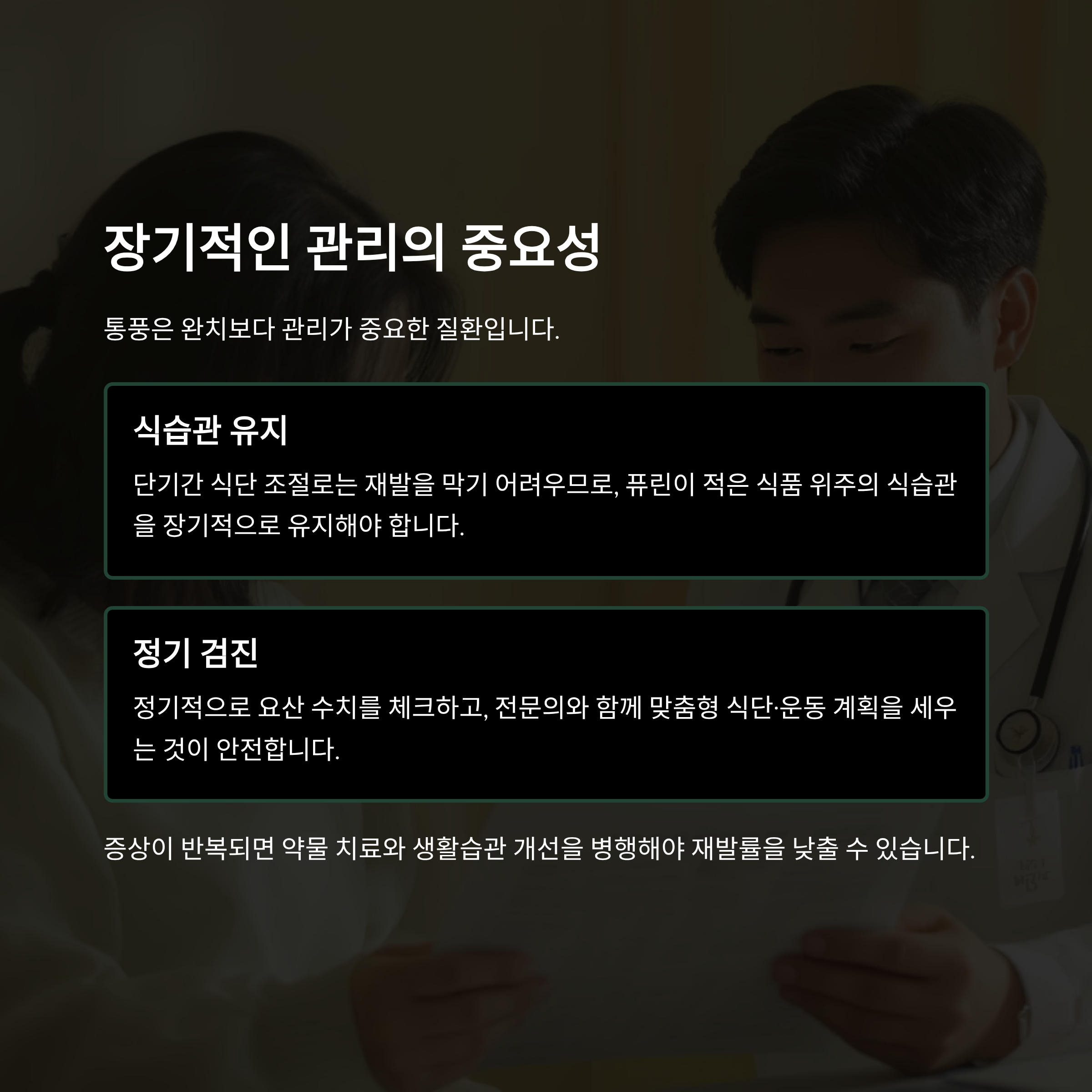 통풍은 완치보다 관리가 중요한 질환입니다.