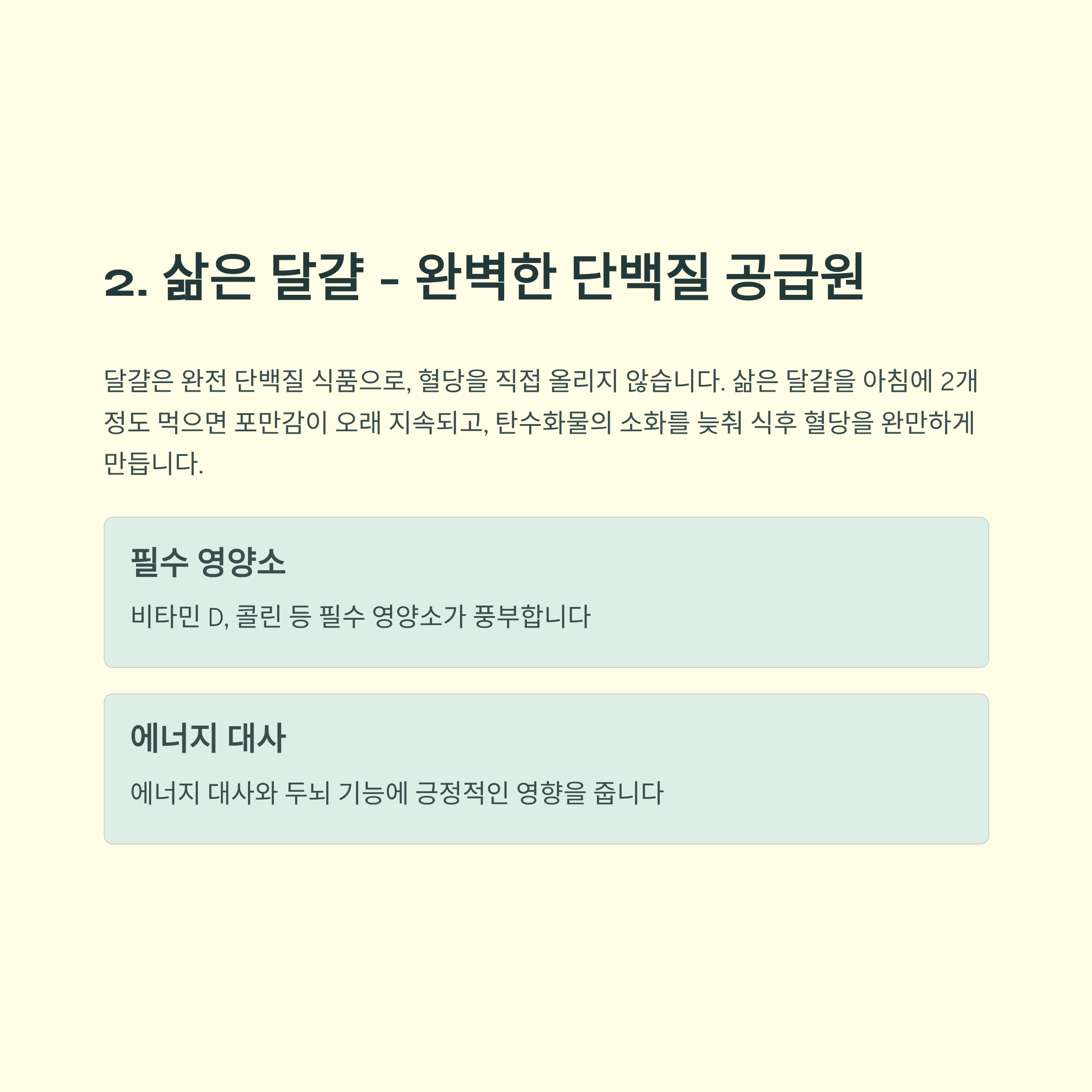 달걀은 완전 단백질 식품으로, 혈당을 직접 올리지 않습니다.