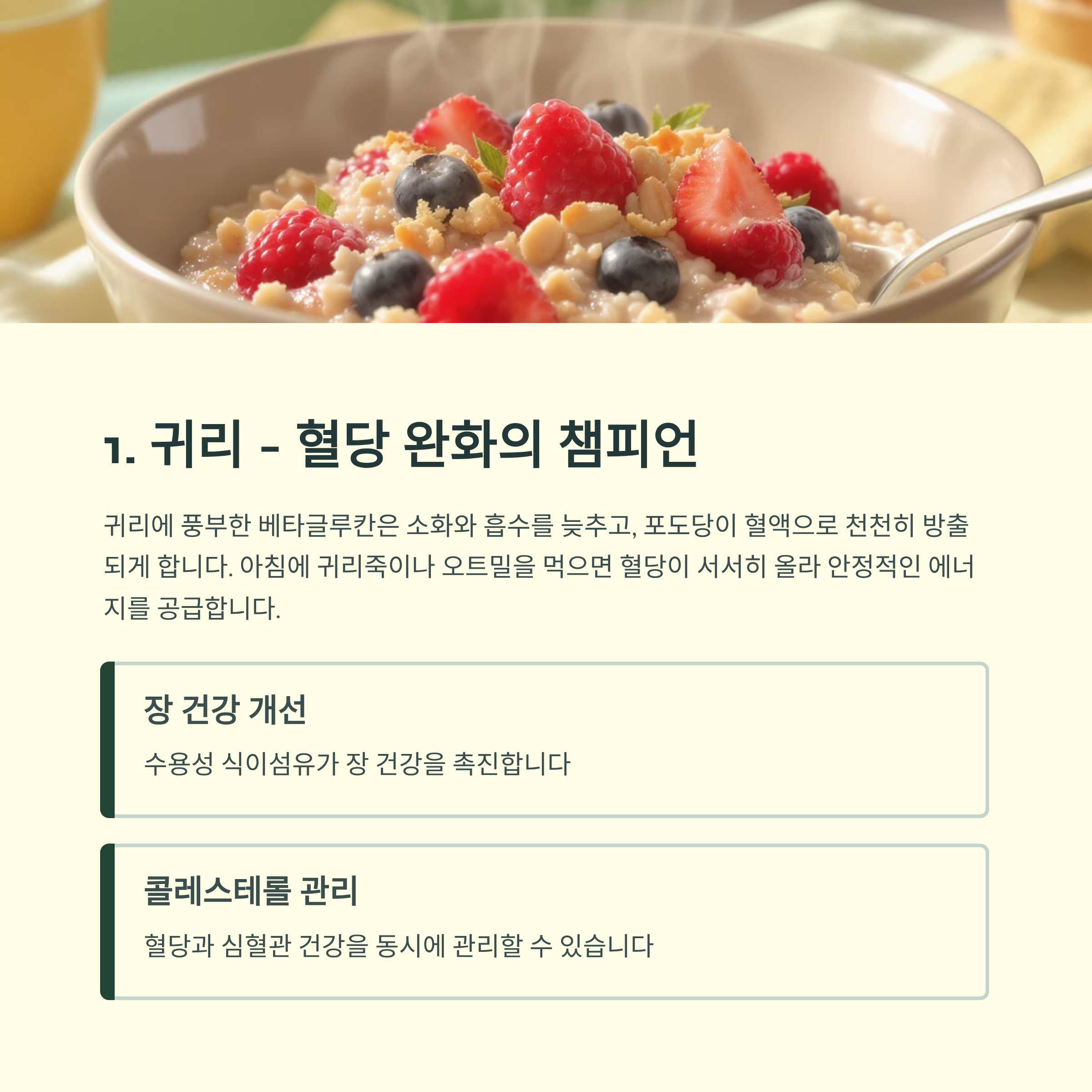 | 귀리 | 베타글루칸, 식이섬유 | 혈당 상승 완화, 장 건강 개선 |