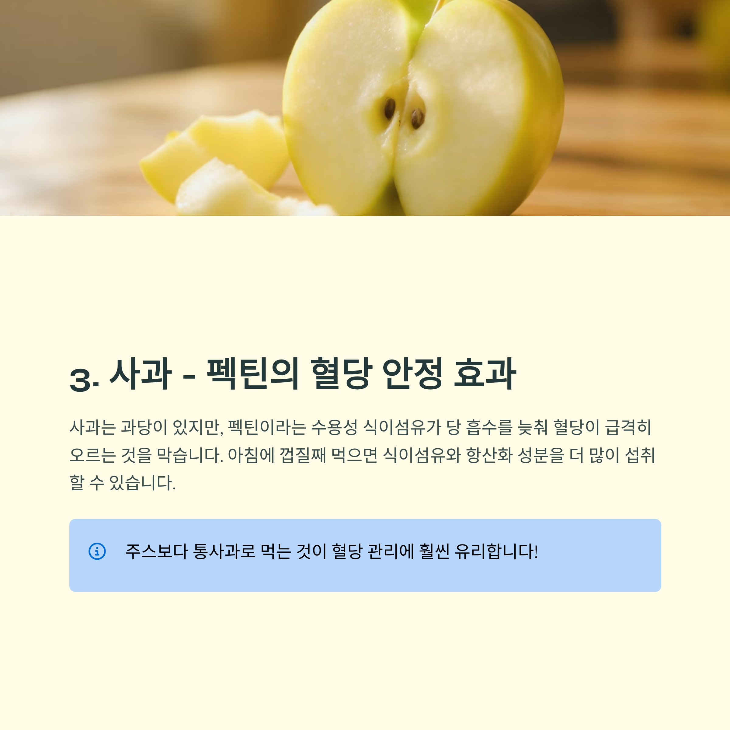 주스보다 통사과로 먹는 것이 혈당 관리에 훨씬 유리합니다.