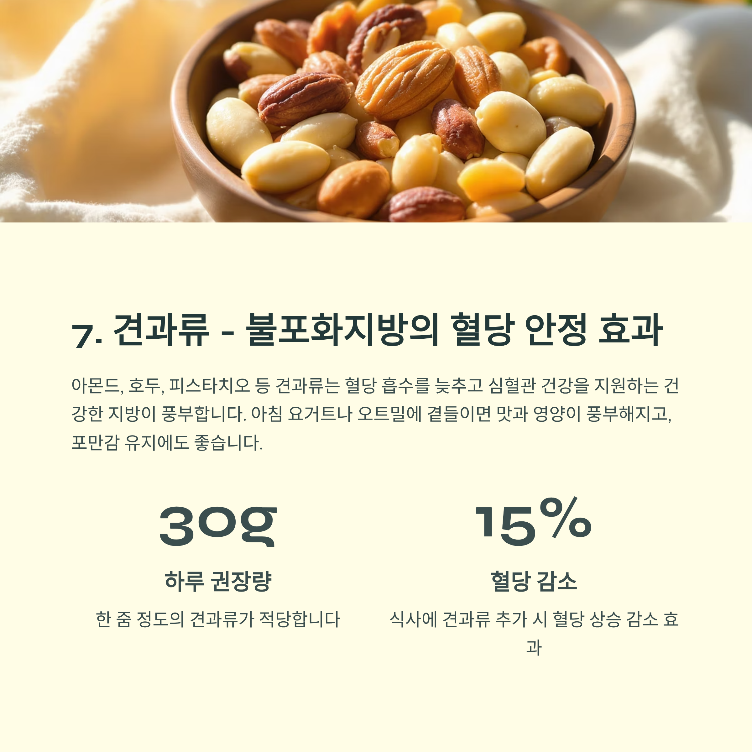 | 아몬드 | 불포화지방, 마그네슘 | 혈당 지수 감소, 심혈관 건강 |