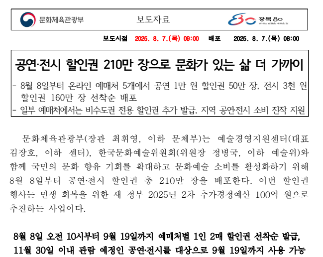 보도자료 - 공연·전시 할인권 210만 장으로 문화가 있는 삶 더 가까이 | 문화체육관광부