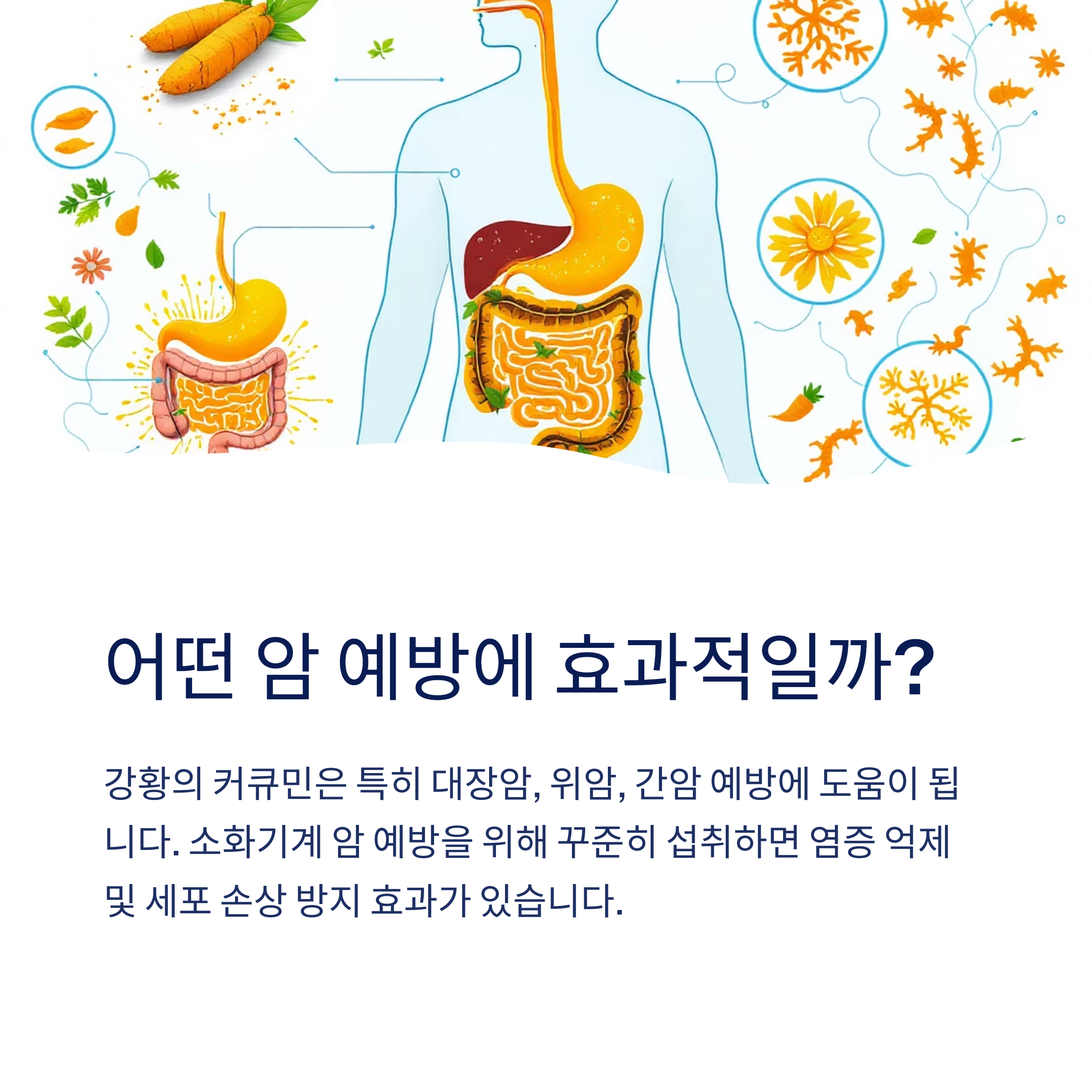 강황의 커큐민은 특히 대장암, 위암, 간암 예방에 도움이 될 수 있습니다.