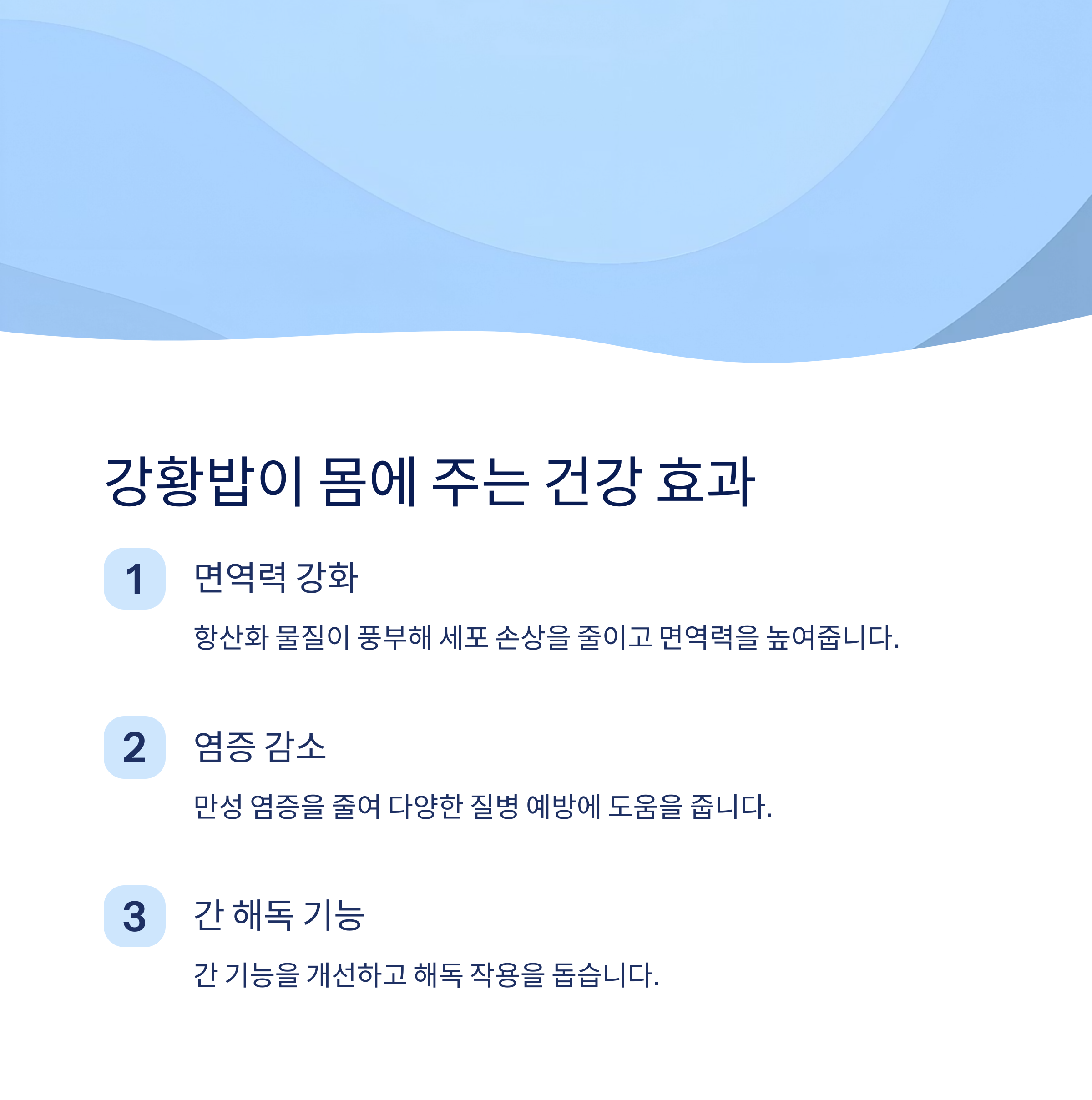 강황은 면역력 강화, 염증 감소, 간 해독 기능 개선에 도움을 줄 수 있습니다.
