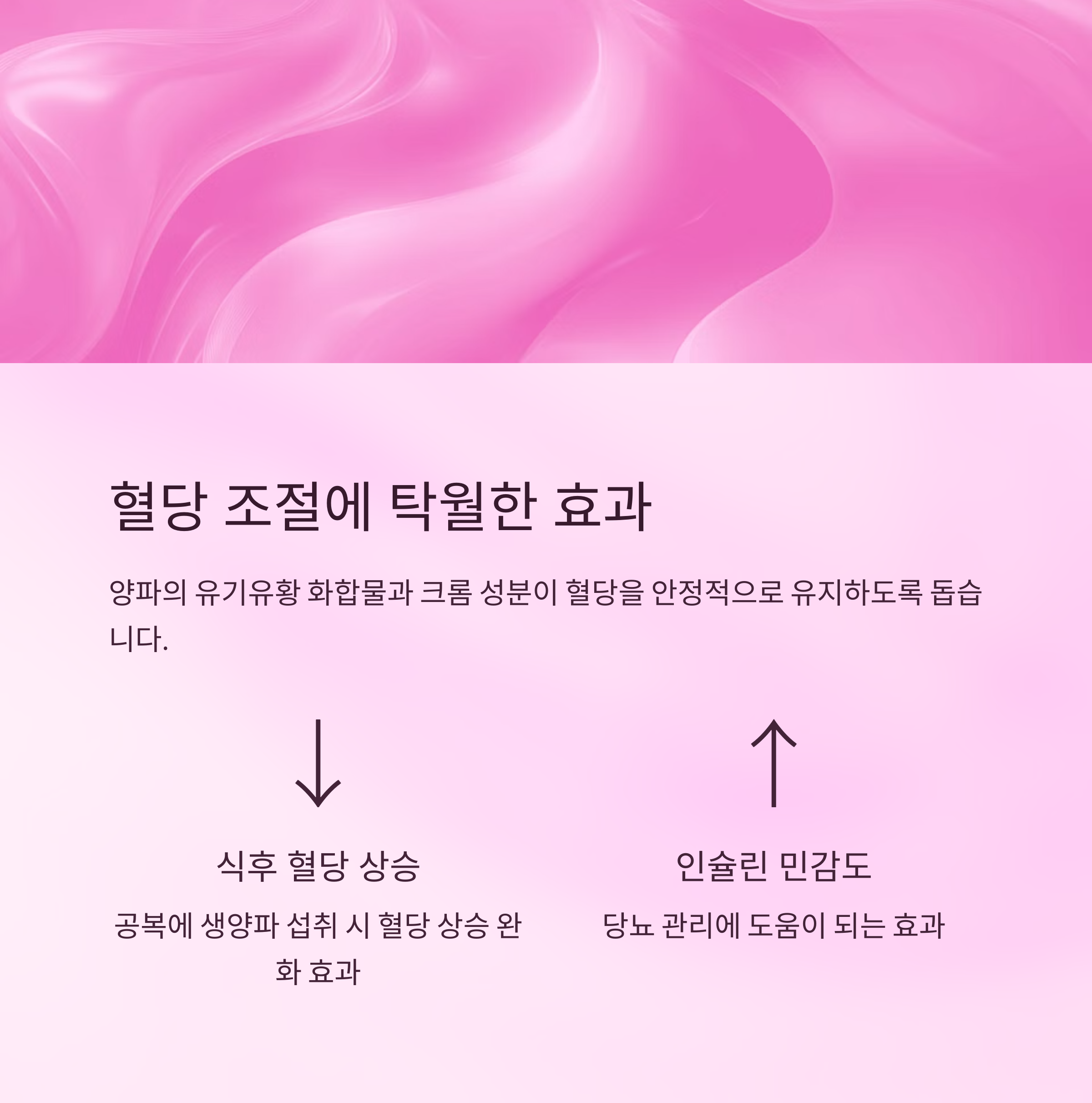 양파에 포함된 유기유황 화합물과 크롬 성분이 혈당을 안정적으로 유지하도록 돕습니다.