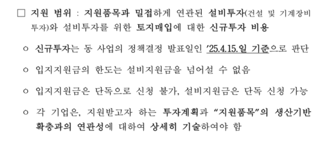 | 지원범위 | 설비투자, 토지매입, 기계장치 구입, |