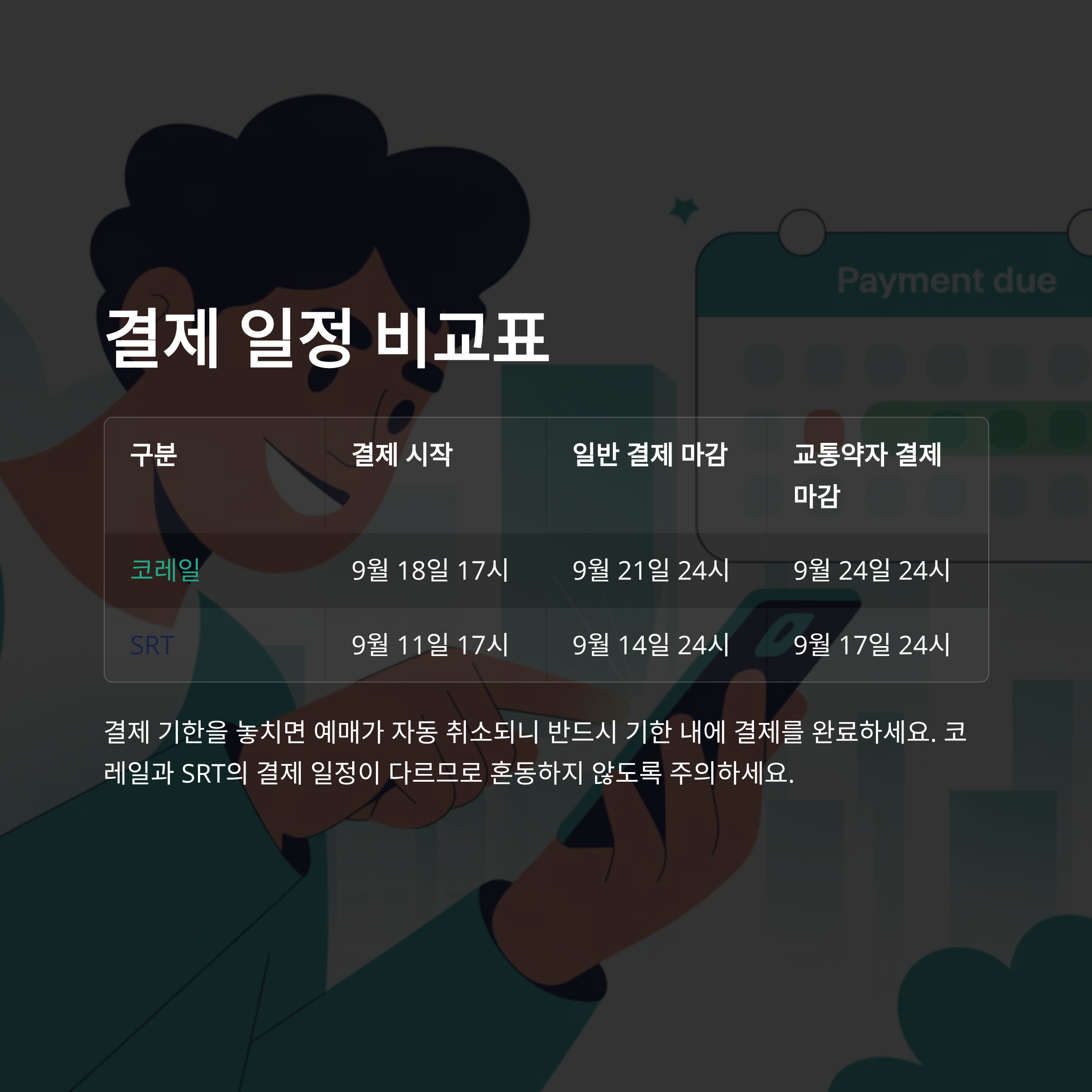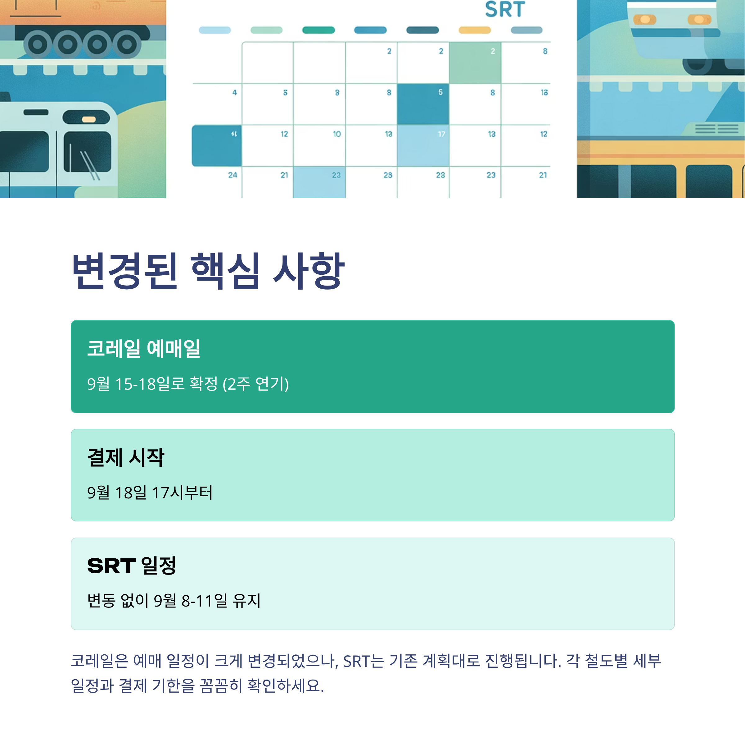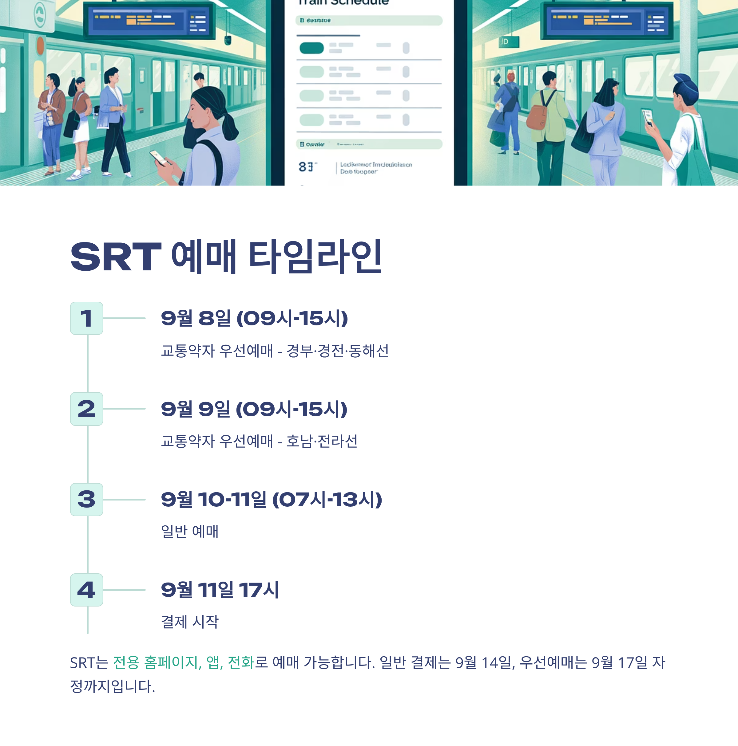 SRT는 계획대로 9월 8~11일 예매를 진행하며, 세부 시간과 결제 기한은 변동 없습니다.