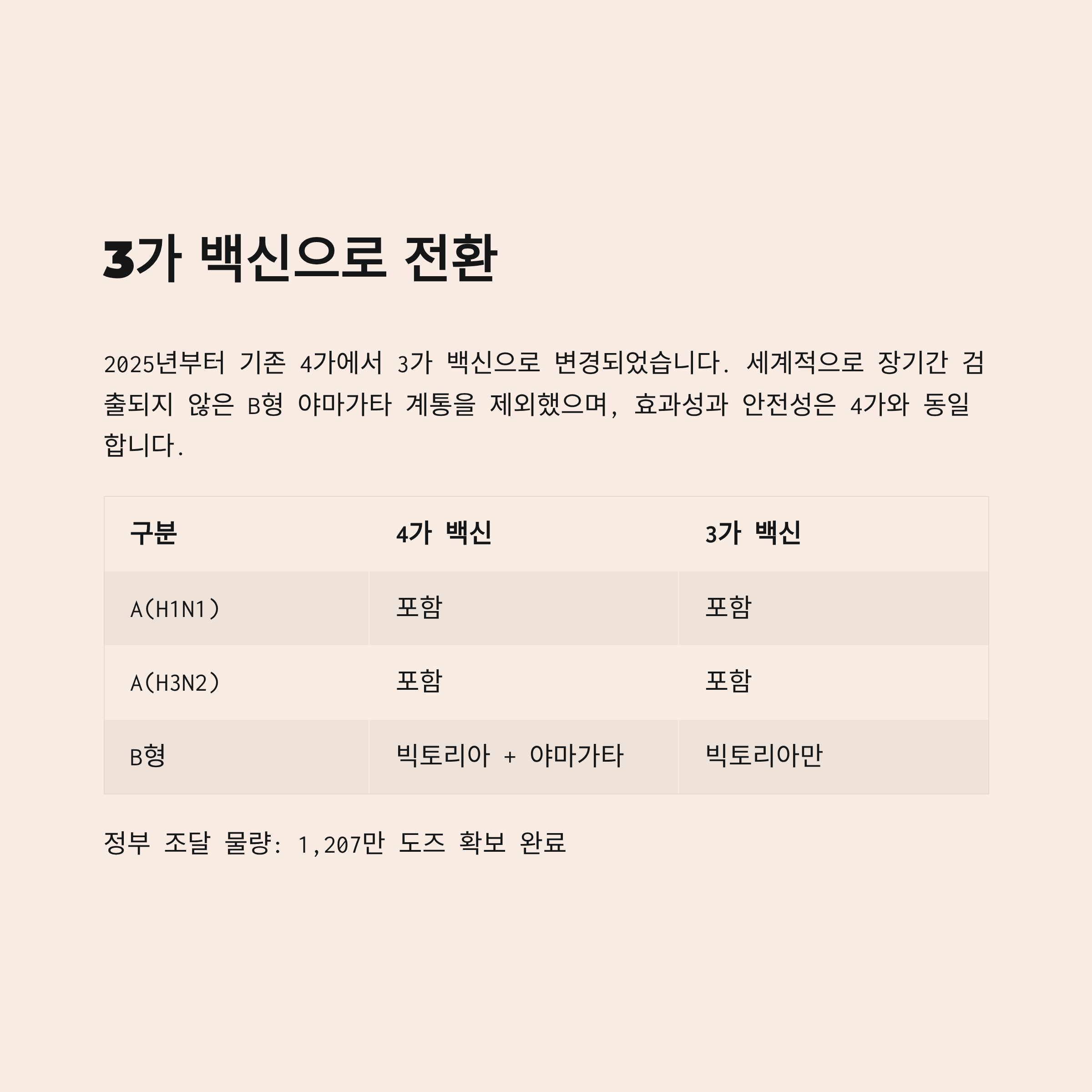 이번 절기에는 기존 4가에서 3가 백신으로 전환되어 접종이 이뤄집니다.