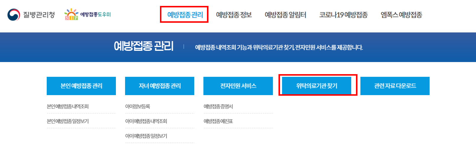 예방접종 관리에서 위탁의료기관 찾기 메뉴를 여십시오.