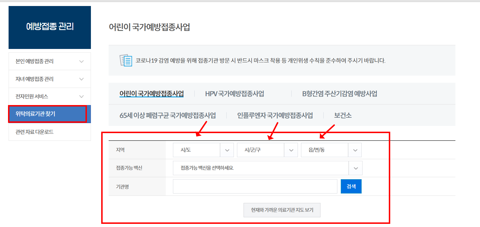 어린이 국가예방접종 페이지에서도 의료기관 검색이 가능합니다.