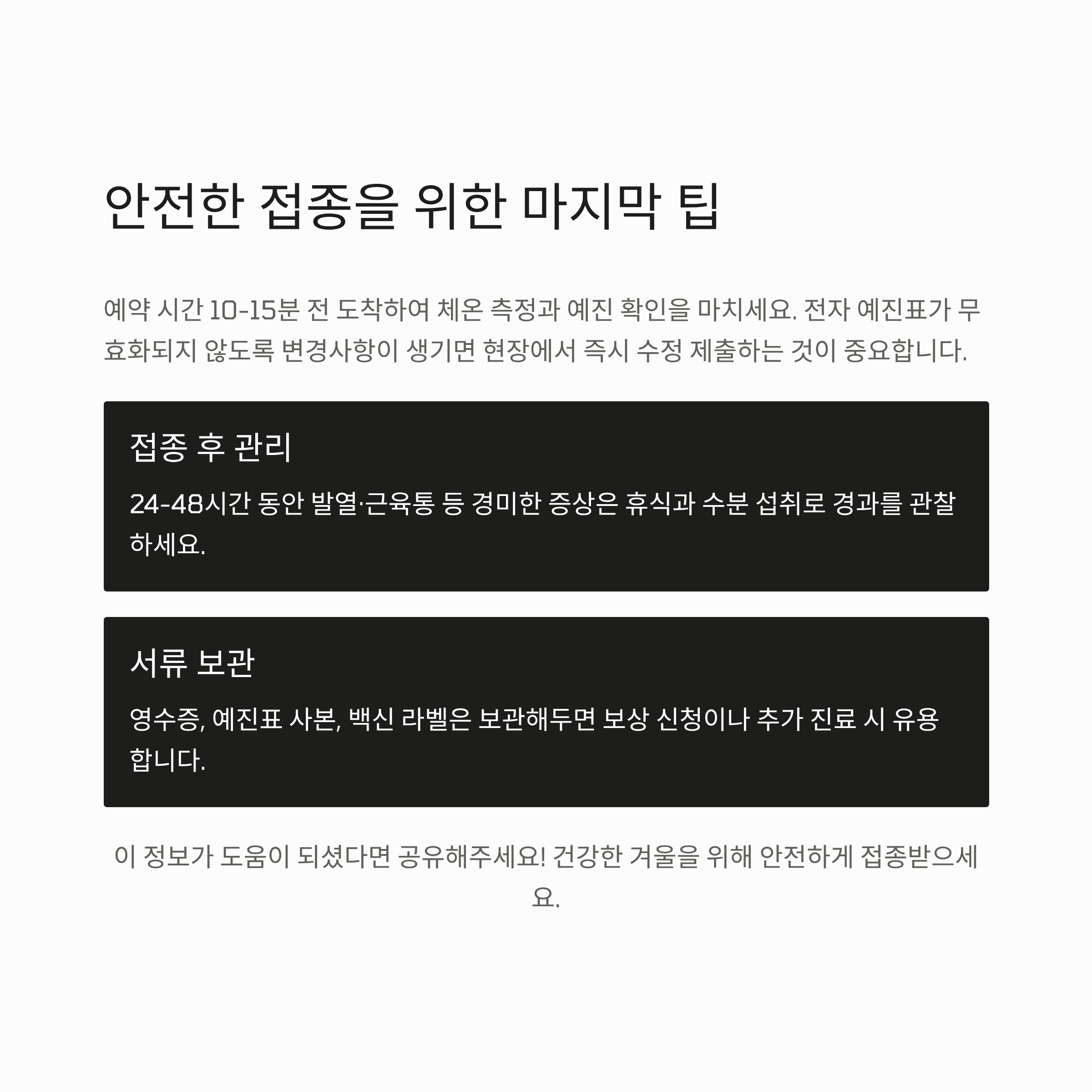 영수증·예진표 사본·백신 라벨/스티커는 보관해두면 보상 신청이나 추가 진료 때 유리합니다. 마지막으로, 예약 시간 10–15분 전 도착해 체온 측정·예진 확인을 마치고, 독감 무료접종 전자 예진표가 무효화되지 않도록 변경 사항이 생기면 현장에서 즉시 수정 제출하세요.