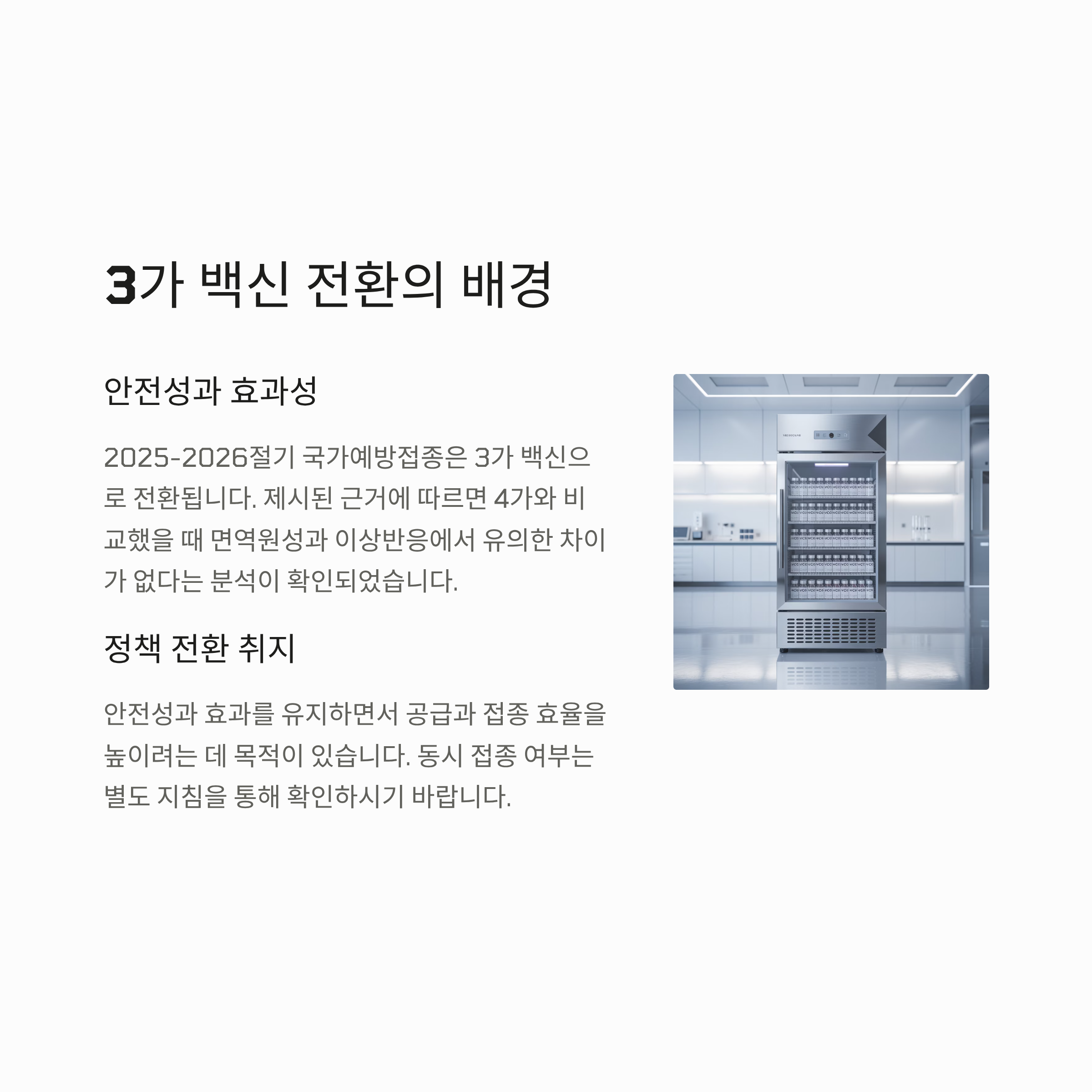2025 2026절기 국가예방접종은 3가 백신으로 전환됩니다. 제시된 근거에 따르면 4가와 비교했을 때 면역원성과 이상반응에서 유의한 차이가 없다는 분석이 제시되어 있습니다. 정책 전환의 취지는 안전성과 효과를 유지하면서 공급과 접종 효율을 높이려는 데 있습니다.