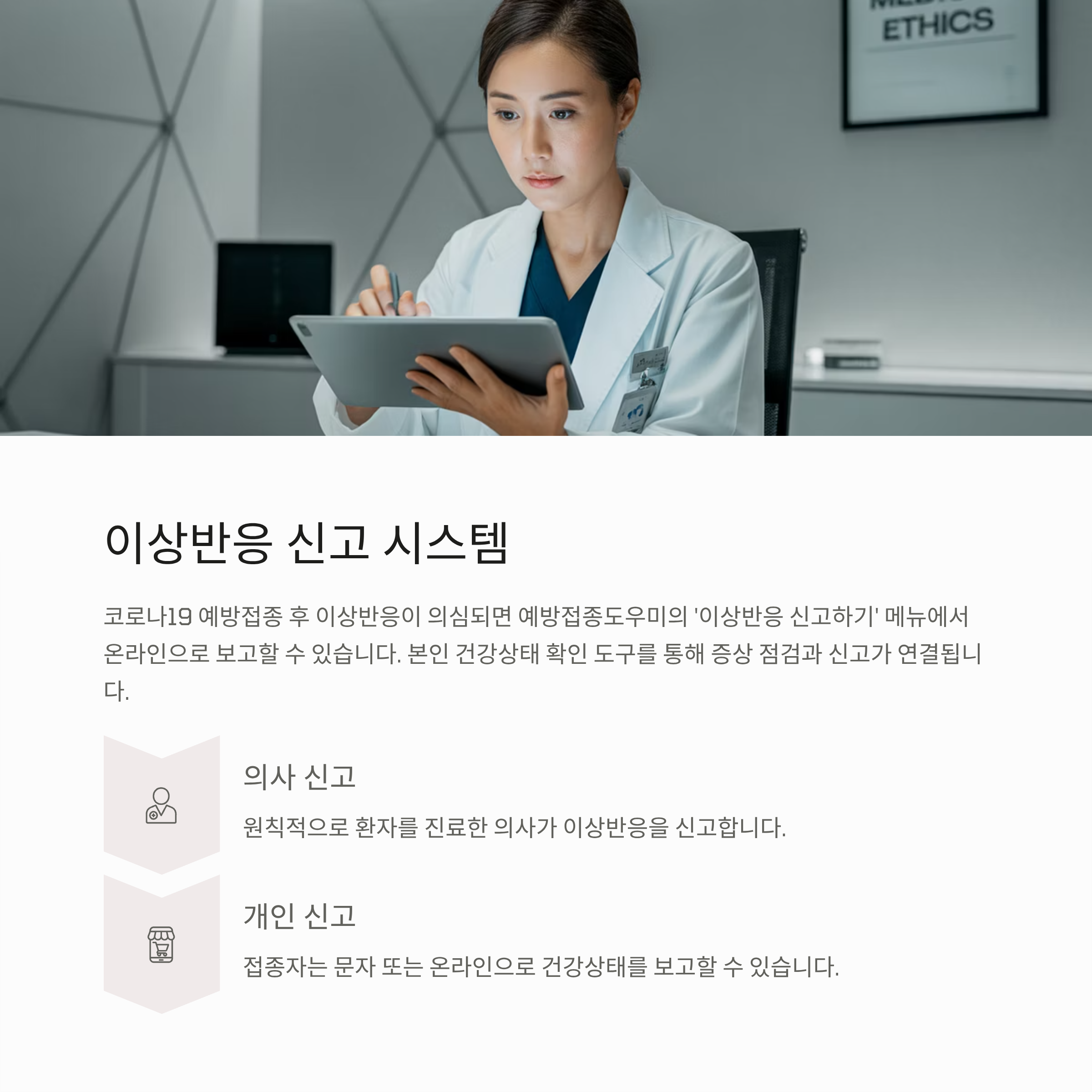 코로나19 예방접종의 경우 원칙적으로 환자를 진료한 의사가 이상반응을 신고하며, 접종자는 문자 또는 온라인으로 건강상태를 보고할 수 있다는 안내가 제공되어 왔습니다. 기본 흐름을 이해하면 혼선을 줄일 수 있습니다.