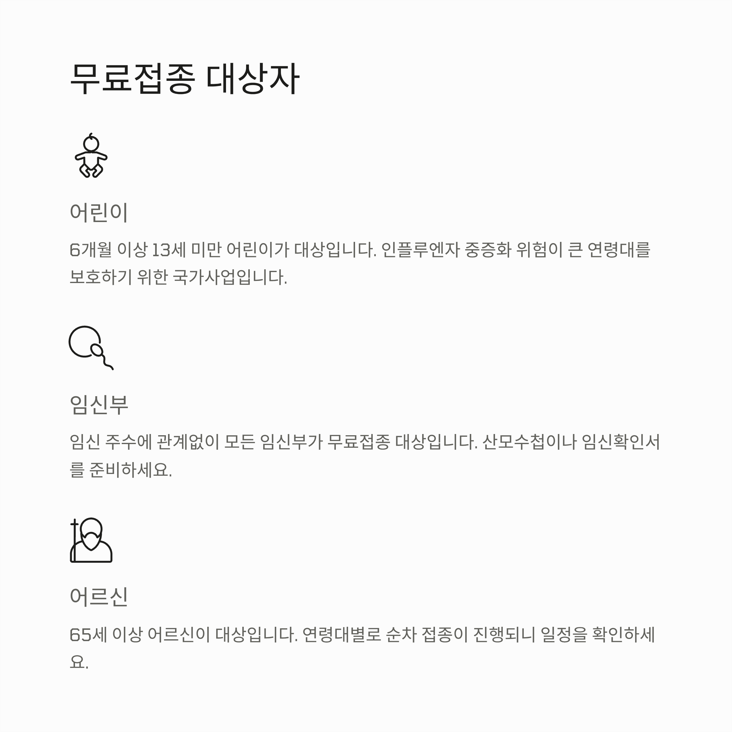 무료접종 대상은 6개월 이상 13세 어린이, 임신부, 65세 이상 어르신입니다. 이는 인플루엔자 중증화 위험이 큰 군을 보호하기 위한 국가사업의 기본 틀입니다