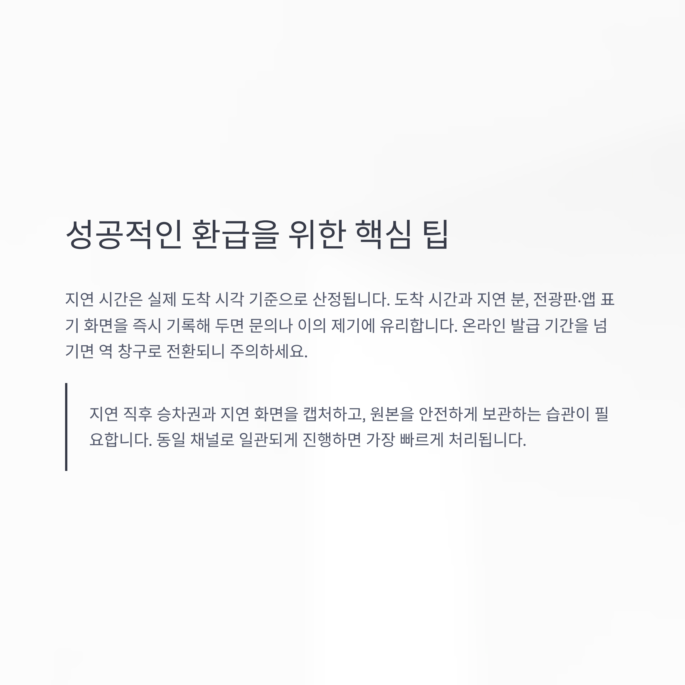 무엇보다 지연은 실제 도착 시각 기준입니다. 도착 시각, 전광판·앱의 지연 표기, 차내 방송 안내 등을 즉시 촬영해 두고, 정해진 신청 기간 안에 동일 채널(앱/웹 또는 역 창구)로 일관되게 접수하면 가장 빠르게 끝납니다.