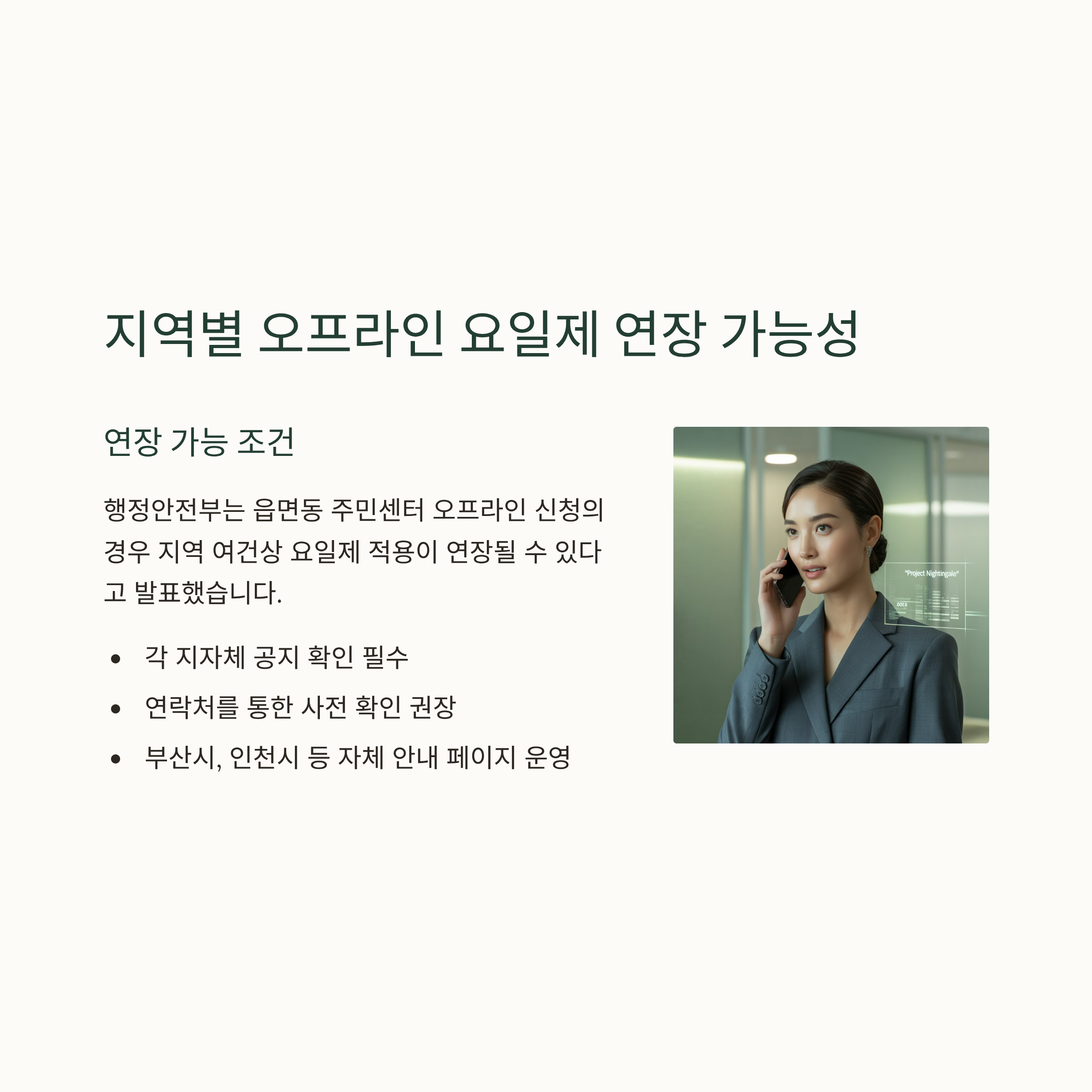 행정안전부는 읍면동 주민센터 오프라인 신청의 경우 지역 여건상 요일제 적용이 연장될 수 있다고 밝혔습니다.  연장이 가능한지 여부는 각 지자체 공지와 연락처를 통해 반드시 사전에 확인하는 것이 안전합니다. 부산시와 인천시 등 지방자치단체도 자체 안내 페이지에서 신청 기간과 사용기한, 운영 방침을 상세히 공지하고 있습니다. (부산광역시)