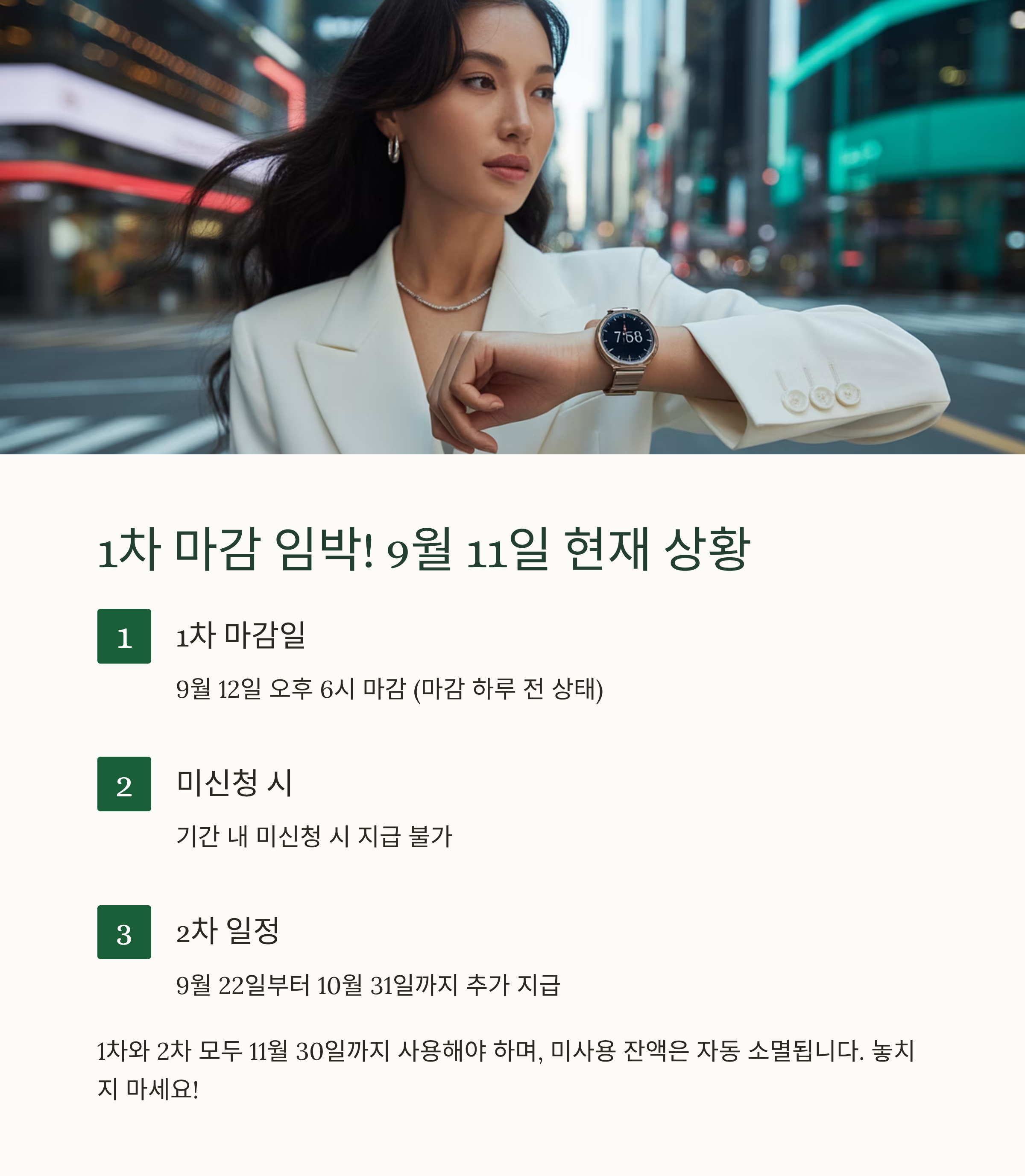 오늘 기준으로 1차 신청은 9월 12일 오후 6시에 마감되며, 기간 내 미신청 시 지급이 불가합니다. 정부는 2차 추가 지급을 9월 22일부터 10월 31일까지 예고해 두었습니다. 1차와 2차 모두 11월 30일까지 사용해야 하며, 미사용 잔액은 자동 소멸됩니다 아래 표에서 일정과 기한을 다시 확인할 수 있습니다